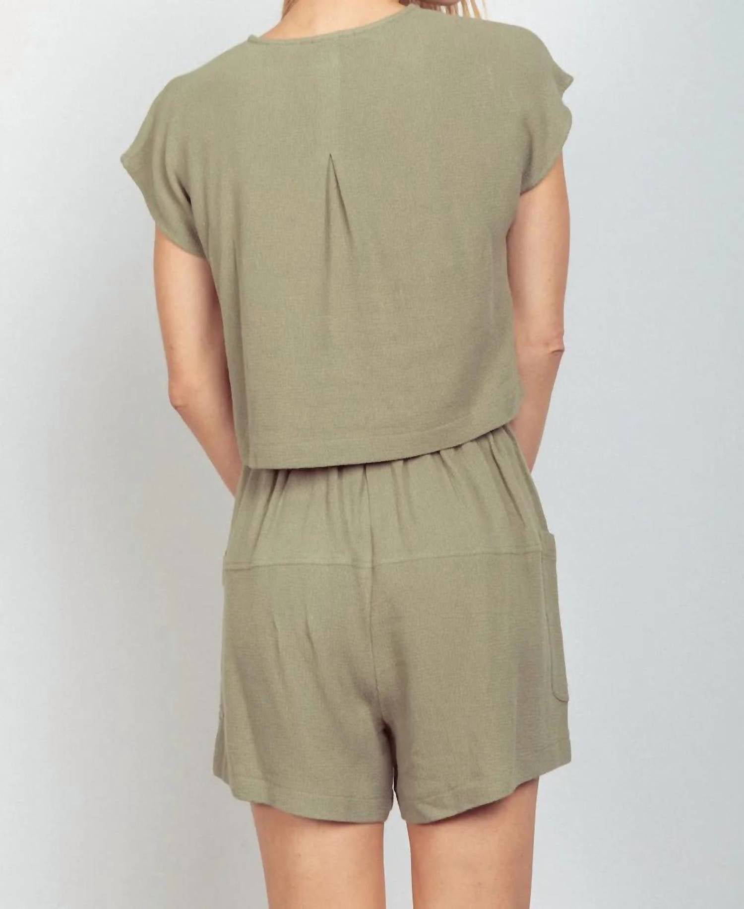 A match made in heaven. This two-piece set is so cute, you'll wish you could wear it out of the house! Did we mention how comfortable it is, too? You may want two sets! Elevate your summer wardrobe with the Very J Woven Cropped Top & Waist Tie Shorts Set by Trendsi in a charming sage hue. This two-piece ensemble features a short sleeve cropped top with a v-neckline and high-waisted waist-tie shorts with pockets, offering a playful yet sophisticated look. Made from a comfortable blend of 55% viscose and 45% linen, this set is perfect for vacations and loungewear. Imported for quality, care for it easily with a machine wash in cold water and tumble dry low. Available in sizes S-L with bust measurements ranging from 35 to 37 inches, ensuring a flattering fit.