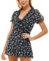 Daisy-fresh and designed with delicate ruffles| Trixxi's wide-leg romper makes a sweet statement.| Approx. inseam; 1-1/2| V-neck with ruffled trim; back zipper closure| Ruffled trim at inset waistband; wide-leg design| Puff short sleeves with ruffled cuffs| Partially lined