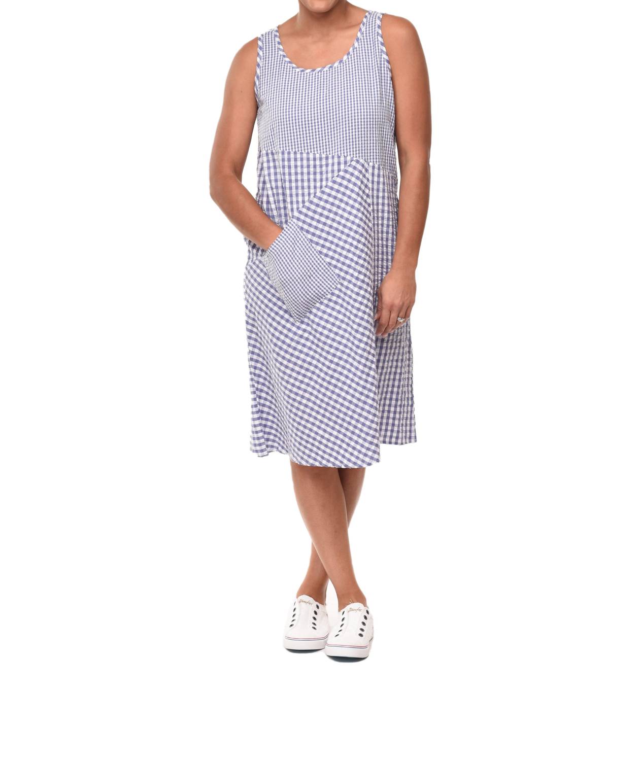 A midi dress so versatile, your options for wearing it are endless. Introducing the Dawson Dress by Tulip Clothing, a charming choice in Peri Checks perfect for a Spring occasion. This sleeveless, knee-length A-line dress boasts a round scoop neckline with contrast detail, gingham pattern, and practical elements like a patch and side seam pockets. Made from 100% cotton, it ensures breathability and comfort for warm weather celebrations. Closure: Pull-on. Chest measurements range from 38" to 48", and lengths from 41" to 43.5". Chest XS 38", S 40", M 42", L 44", XL 46", XXL 48". Length XS 41", S 41.5", M 42", L 42.5", XL 43", XXL 43.5".
