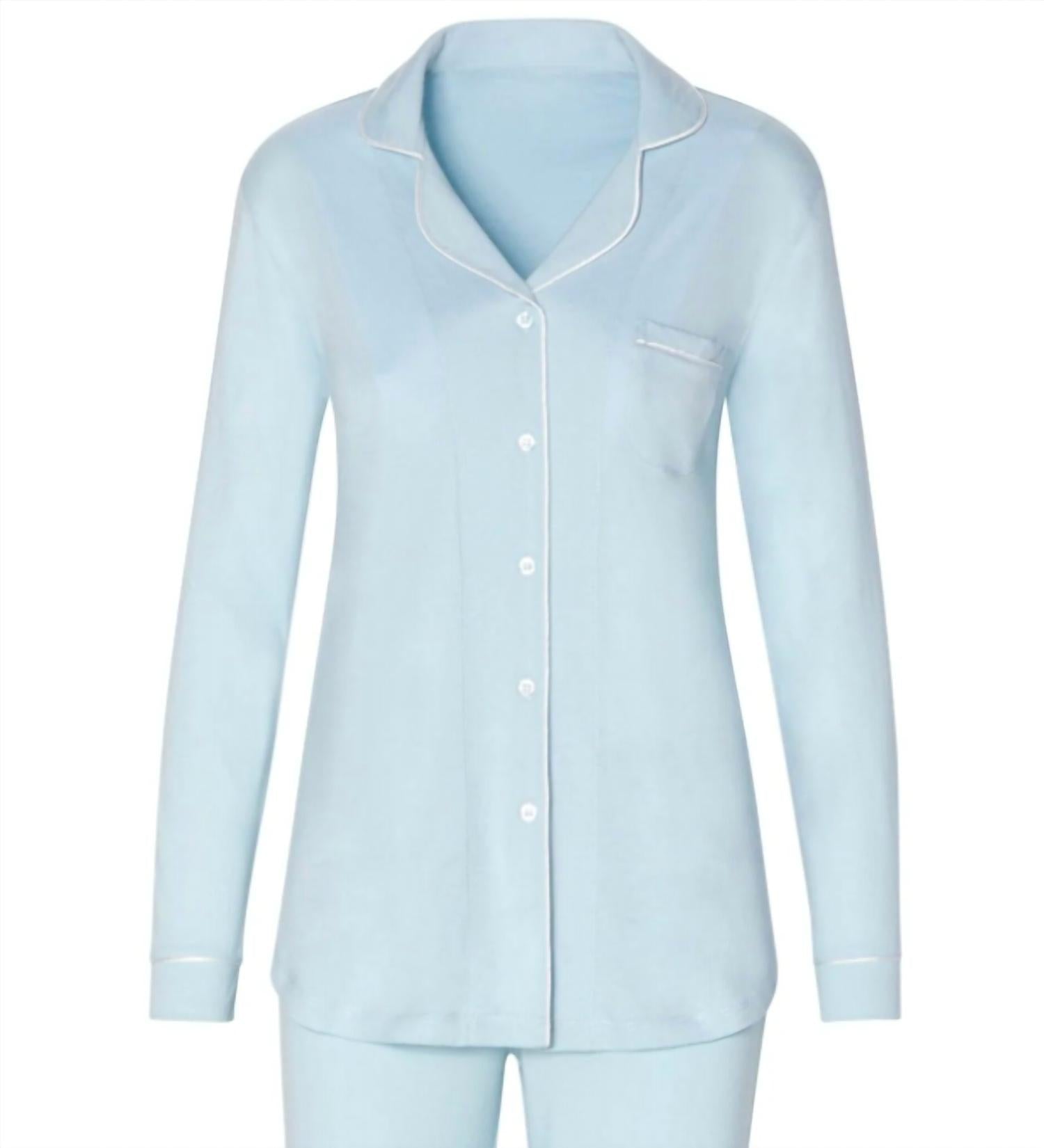 The Paige Long Sleeve Cropped Pant Men's Styled Pajama Set by Twelve Eighty Eight is designed for a feminine touch in a classic Starlight Blue. Crafted from a luxurious blend of 50% Peruvian Pima Cotton and 50% Modal, this set includes a top with a full 5-button front closure and elegant ivory piping on the collar, placket, and front pocket. The cropped pants feature a 28-inch elastic waistband and a 21-inch inseam in size small, with adjustments by size. Care for this cotton blend set by machine washing on a gentle cycle and tumble drying on low heat.