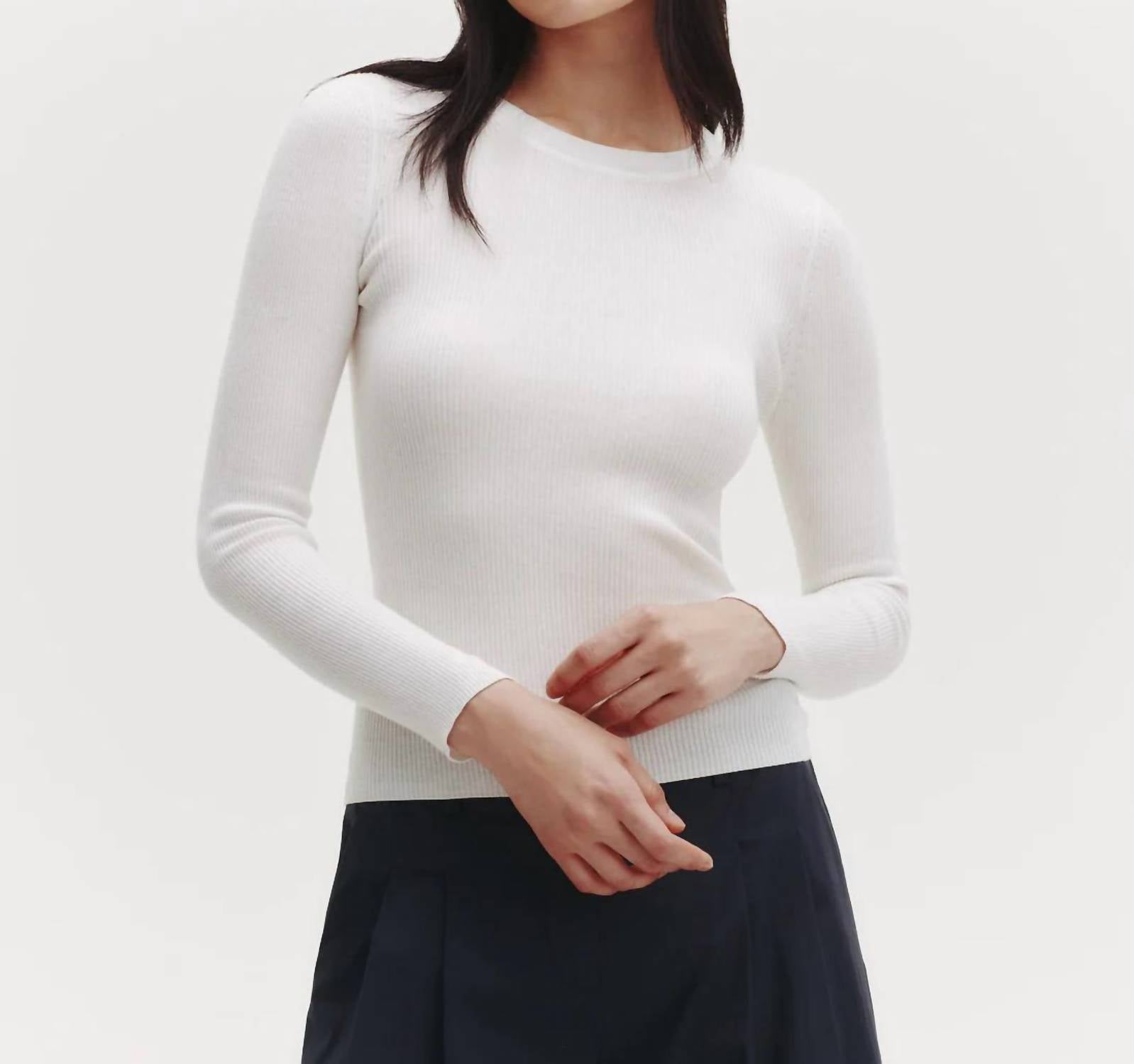 Ribbed, form-fitting essential crafted from 100% cotton in a soft, stretchy material. Long sleeve top in ivory features a classic crew neck, designed for standalone wear or layering under a button-down. Closure is a convenient pull-on style, perfect for effortless styling. Care instructions are simple: hand wash to maintain its minimalist charm.