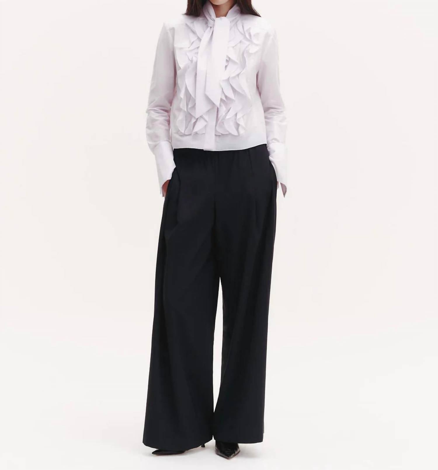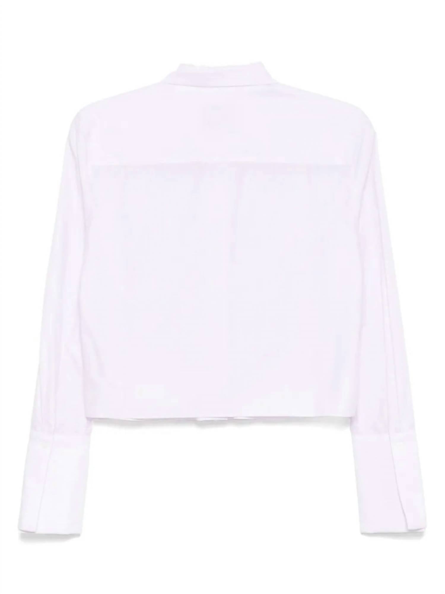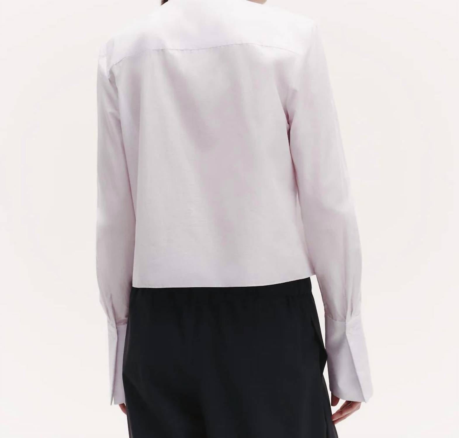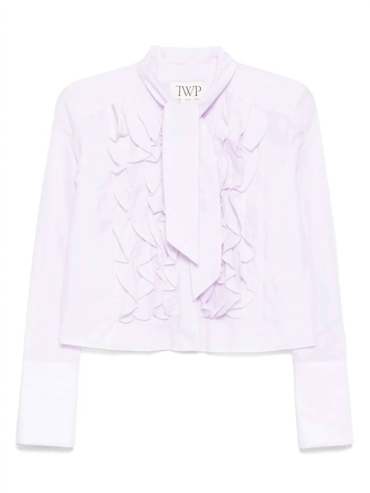 A timeless blouse that will never go out of style. Meet the TWP Patti Top With Tie, a charming cropped blouse crafted from an Italian cotton shirting blend for a luxurious feel. This white and purple striped piece features long sleeves and a mockneck complemented by a playful, ruffled bib and a neck-tie. Designed for both style and comfort, it offers a slightly fitted bust and a concealed button closure for elegance. Expertly made in the USA, this top is the epitome of preppy fashion, ideal for vacation and Mother's Day celebrations.