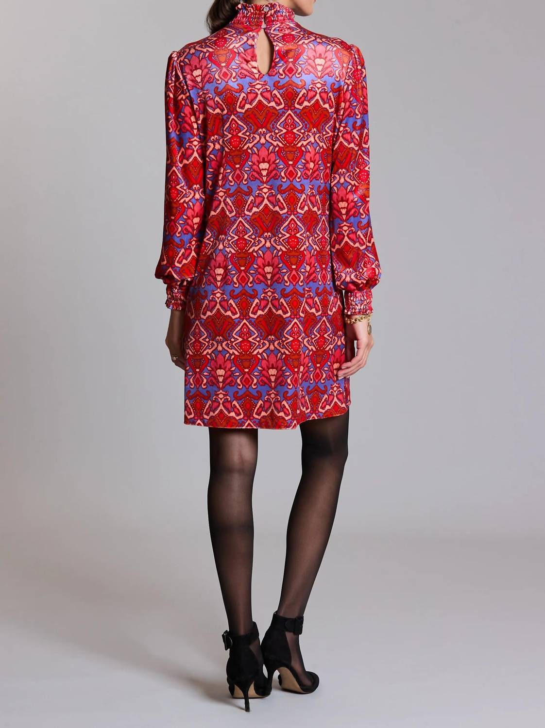 A short and breezy dress for those warmer days. Introducing the Velvet Tribal Marni Mini Dress by Tyler Boe, a perfect choice for your holiday gatherings. This dress showcases long sleeves with smocked cuffs and a smocked high neckline, complemented by a chic keyhole back. Made from 100% Polyester and lined for comfort, it offers a stylish shift silhouette with a garment length of 36". It features a button closure and is machine washable for easy care. Model is 5'9" and wearing a size S.