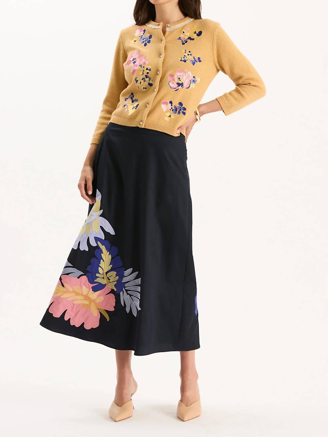 Show off just the right amount of skin in this beautifuly designed midi length skirt. Introducing the Valentina Appliqué Skirt by Tyler Boe, a stunning piece in navy that features bold floral embroidery for an eye-catching look. The skirt is crafted from 100% cotton with a comfortable waistband and an A-line silhouette, providing a classic fit with a flowing 35" midi length. Made for effortless day-to-evening transitions, this workwear-inspired skirt includes a side zip closure for easy wear. Care: Machine wash cold, lay flat to dry.