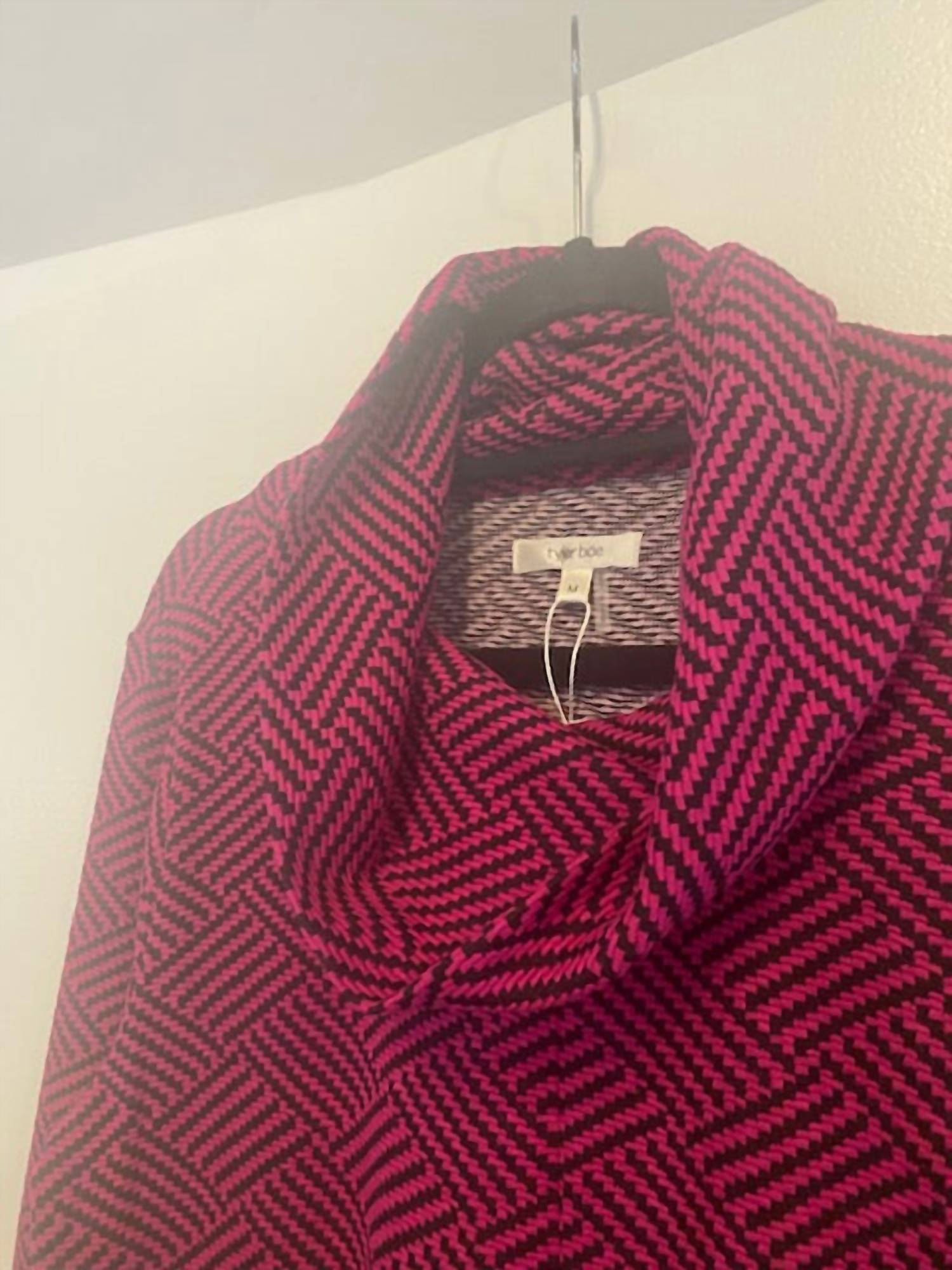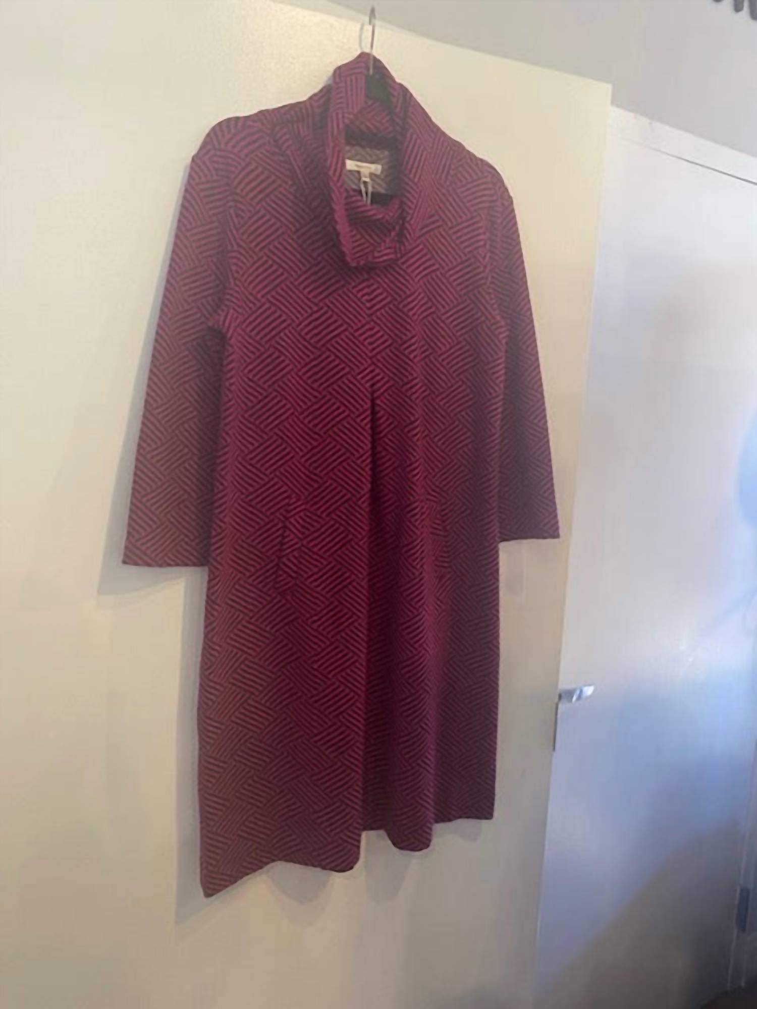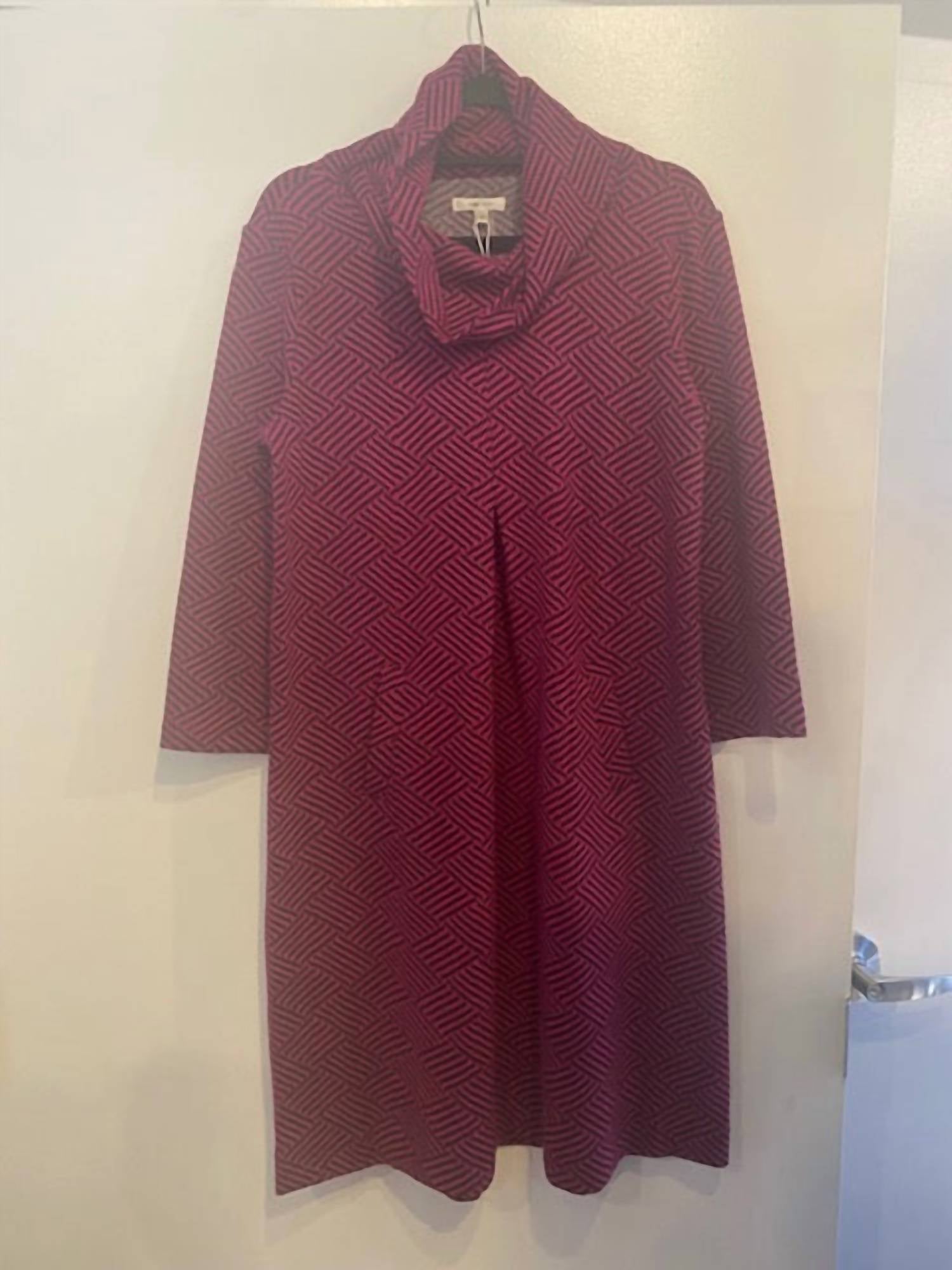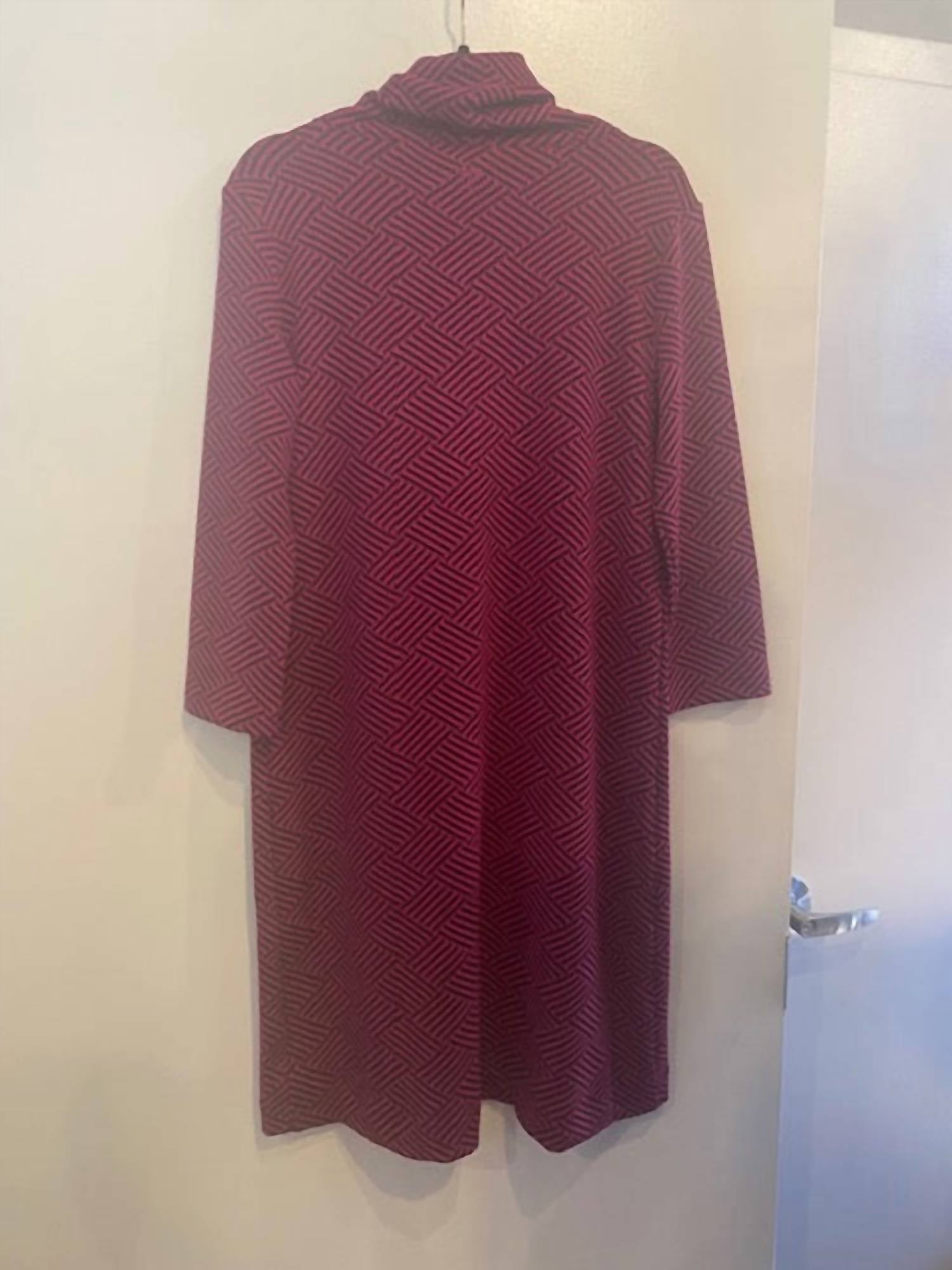 Introducing the Women's Geometric Print Knit Cowl Neck Shift Dress by Tyler Boe, a vintage-inspired piece for your Fall wardrobe. This midi-length dress features a striking geometric pattern in vibrant red with convenient pockets and a stylish cowl neck. It's crafted from smooth polyester, ensuring comfort throughout any occasion, from church gatherings to Thanksgiving festivities. Designed with long sleeves and a practical pull-on closure, it offers effortless style all season long.