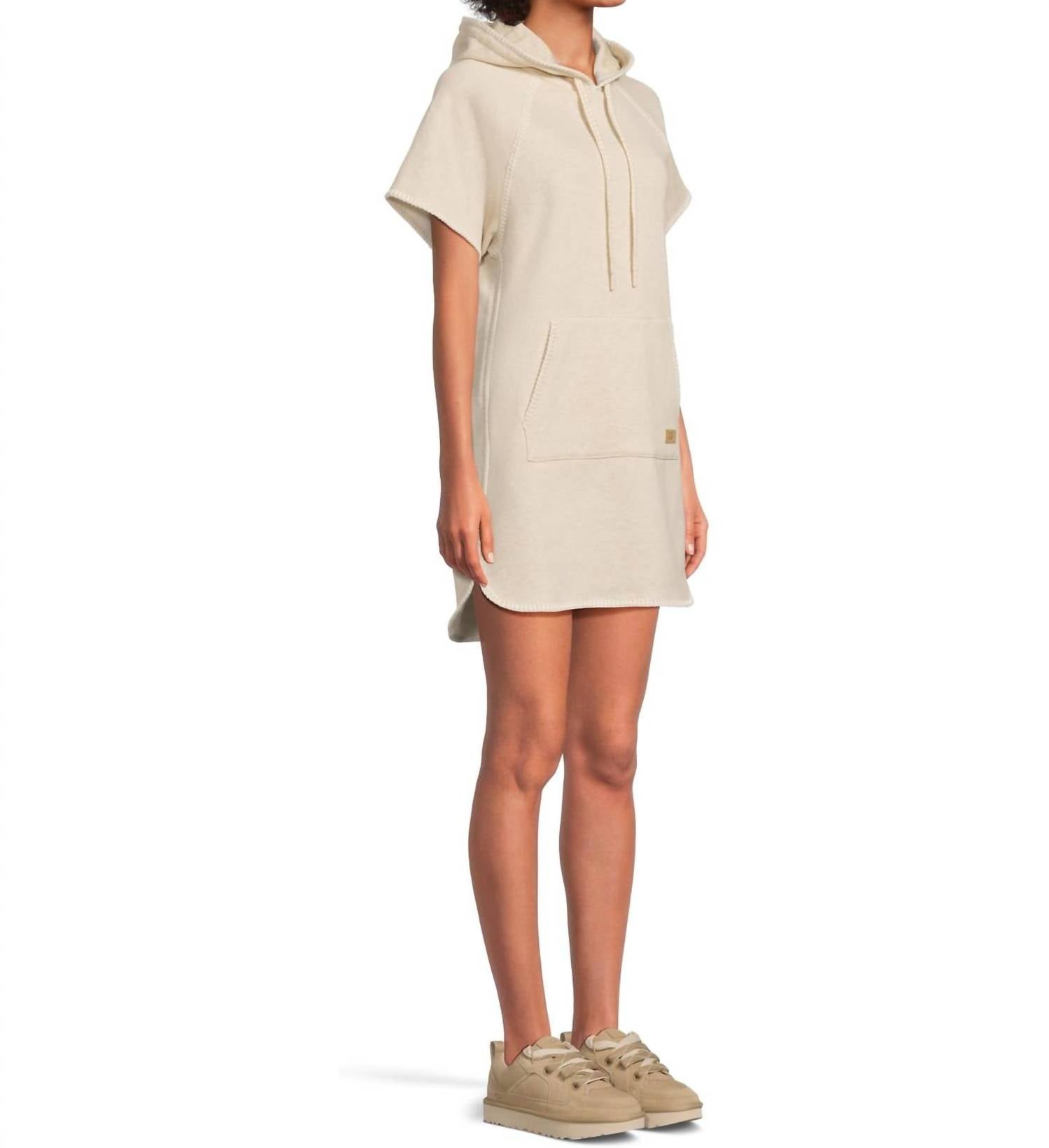 The kind of easy and flattering dress you'll be reaching for all season long. The UGG Classic Hoodie Dress in Sand Heather is designed for ultimate comfort and style, featuring short sleeves and crafted from a cotton blend fabric. This mini dress measures 34 inches in length and offers a hooded neckline with a convenient kangaroo pocket for practicality. Closure is a pull-on style for ease of wear, and the dress is machine washable and can be tumble dried. Made with 55% cotton and 45% recycled polyester, this piece effortlessly blends cozy luxury with a sustainable approach.