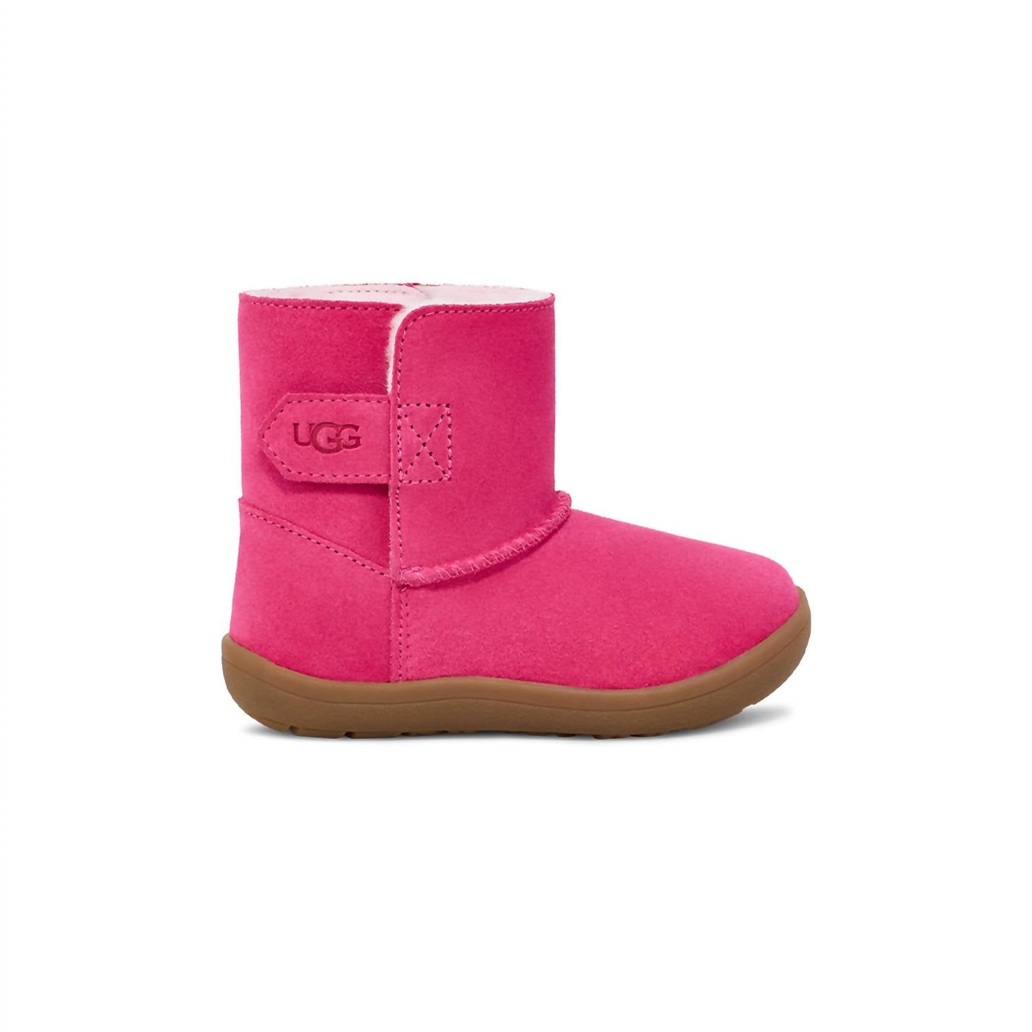 The Toddler Keelan II Boot by UGG in vibrant Berry is crafted for optimal comfort and style. Featuring a soft suede upper, this boot has a convenient hook-and-loop closure for easy wear. It is lined with 10mm UGGplush™, a blend of 60% upcycled wool and 40% TENCEL™ Lyocell, offering eco-friendly warmth and comfort. The molded rubber outsole, containing 30% recycled materials, ensures improved traction and durability, perfect for active toddlers.