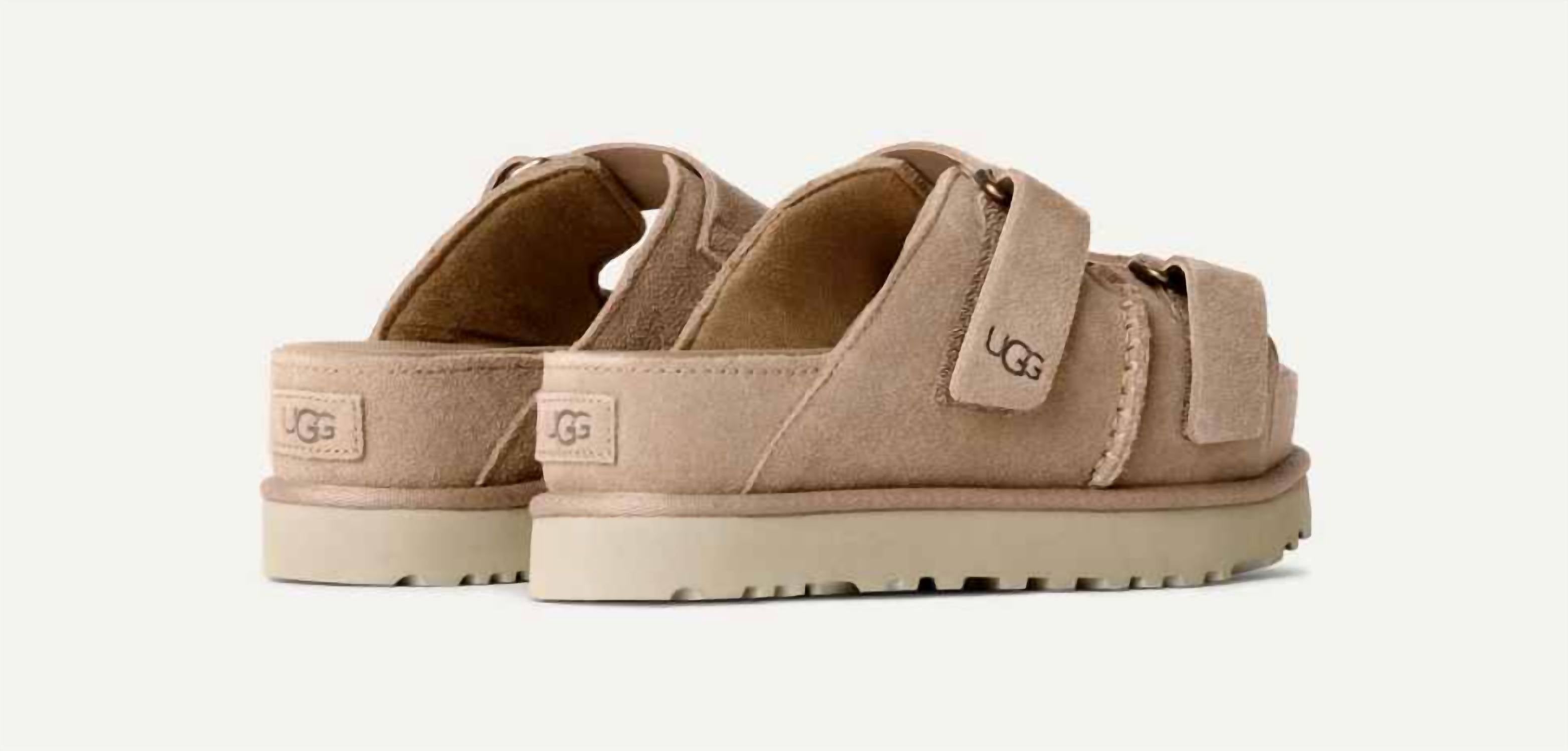 So comfy it's like you're walking on clouds. Step into summer style with the UGG Goldenstar Hi Slide, a sandal designed for unparalleled comfort and elegance. Made with a cushioned leather upper, this slide features adjustable vamp straps with a convenient hook-and-loop closure. The dual-density foam footbed and sugarcane EVA outsole provide remarkable support and lightness. With a textile sockliner made of 100% recycled polyester and a sleek design, this sandal is perfect for vacation-ready looks in a chic sand hue.