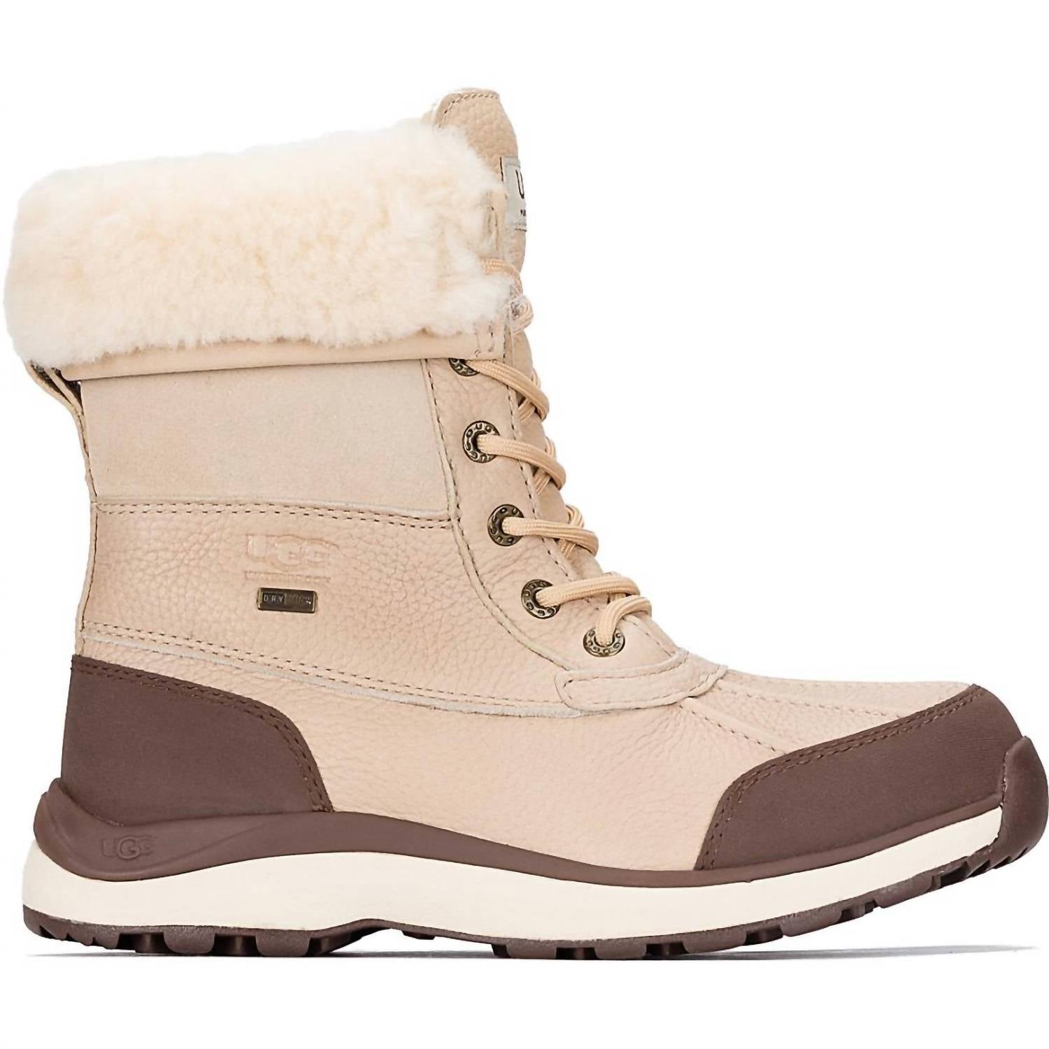 Say hello to the perfect, most versatile boot. The ankle height makes this style easily transition from day to night. Wear them with your favorite skinny jeans and tee for a more laid back look, or pair them with your favorite mini dress and jacket for a night out on the town. UGG introduces the Women's Adirondack III Waterproof Boot in a chic sand hue, crafted for both functionality and style. With a lace-up closure and round toe design, this ankle boot features a Low heel of 1 1/2" and a 3/4" platform for additional height and comfort. Made from a leather upper with UGGpure™ wool textile and faux fur lining, it's temperature-rated to withstand -32 degrees Fahrenheit. Ideal for fall adventures, these boots are imported and equipped with a removable insole and a rugged rubber sole.