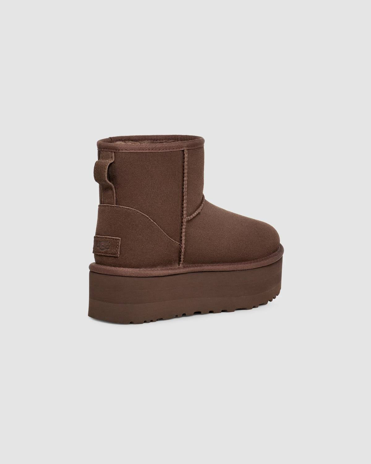 Say hello to the perfect, most versatile boot. The ankle height makes this style easily transition from day to night. Wear them with your favorite skinny jeans and tee for a more laid back look, or pair them with your favorite mini dress and jacket for a night out on the town. The Women's Classic Mini Platform by UGG in Burnt Cedar elevates your style with a chic 2" platform and a 5" shaft height. Crafted from rich suede, it features a plush lining and sockliner made from UGGplush™ wool blend, ensuring softness and comfort. This modern ankle boot showcases a choice of SugarSole™ or Treadlite by UGG™ EVA outsoles, promoting sustainability. Complete with recycled polyester binding and leather heel label, this platform heel boot is a fresh take on nostalgia.