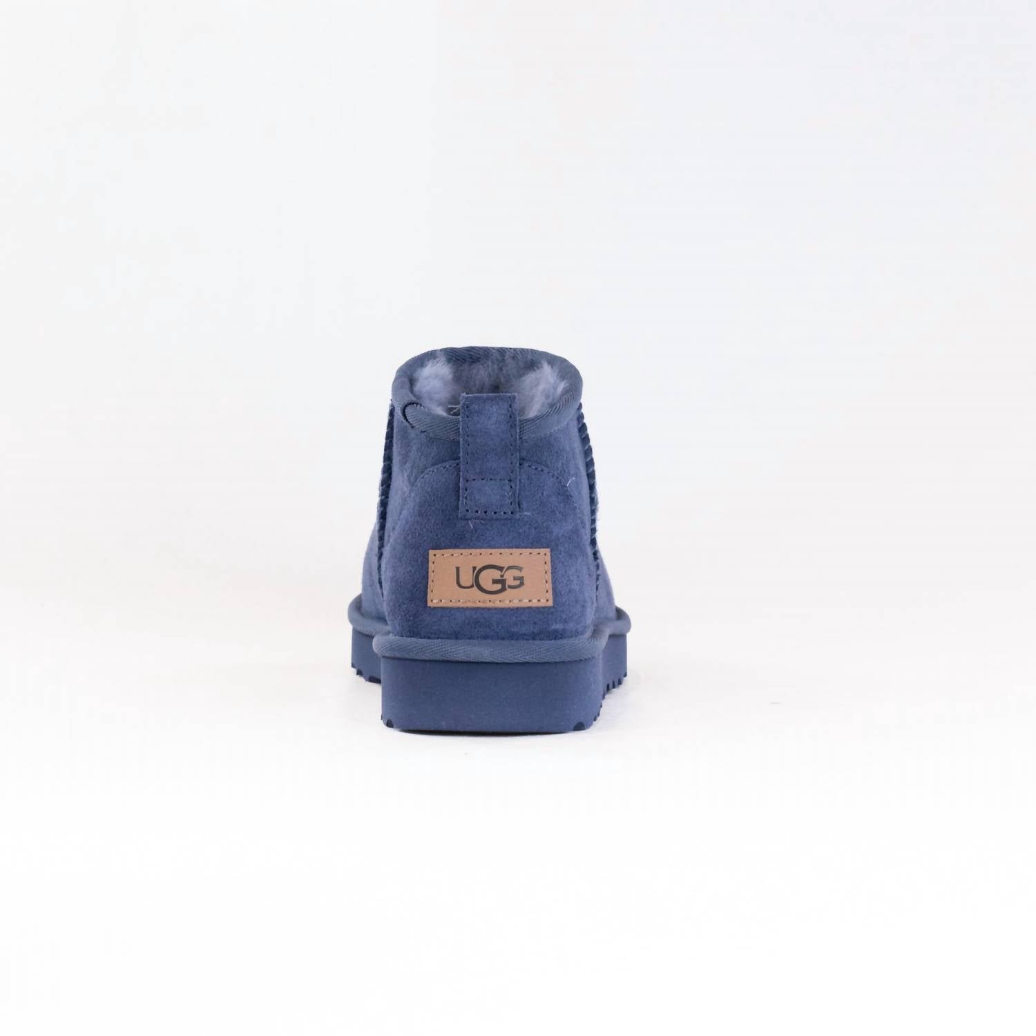 Introducing the Women's Classic Ultra Mini Boot by UGG, an ultimate blend of style and comfort in Desert Blue. Designed with a sheepskin material, this boot features a 17mm Twinface sheepskin upper and an asymmetrical topline for a sleek finish. Made in a factory that supports women through HERproject, this winter staple boasts either a sugarcane EVA or Treadlite by UGG™ outsole for excellent flexibility and reduced environmental impact. The boot is pre-treated for water repellency, has a leather heel label with the embossed UGG® logo, and is ideal for casual settings, including dinner parties during Thanksgiving.