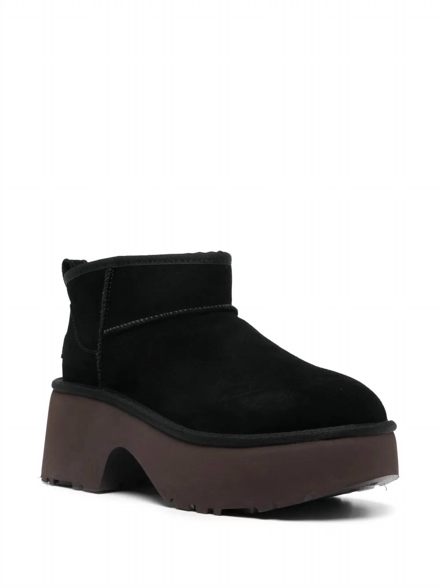 Say hello to the perfect, most versatile boot. The ankle height makes this style easily transition from day to night. Wear them with your favorite skinny jeans and tee for a more laid back look, or pair them with your favorite mini dress and jacket for a night out on the town. Step into style with the Women's Classic Ultra Mini New Heights Boot by UGG, featuring a bold Black suede upper and a cozy UGGplush™ lining for ultimate comfort. Designed with women in mind, this boot boasts a striking 2.75" platform and a 3" block heel for an elevated look. The footwear is completed with a rear pull tab and a durable sugarcane EVA outsole, ensuring both style and functionality. Highlighting sustainable fashion, the vamp lining and sockliner are crafted from 60% upcycled wool and 40% TENCEL™ Lyocell.