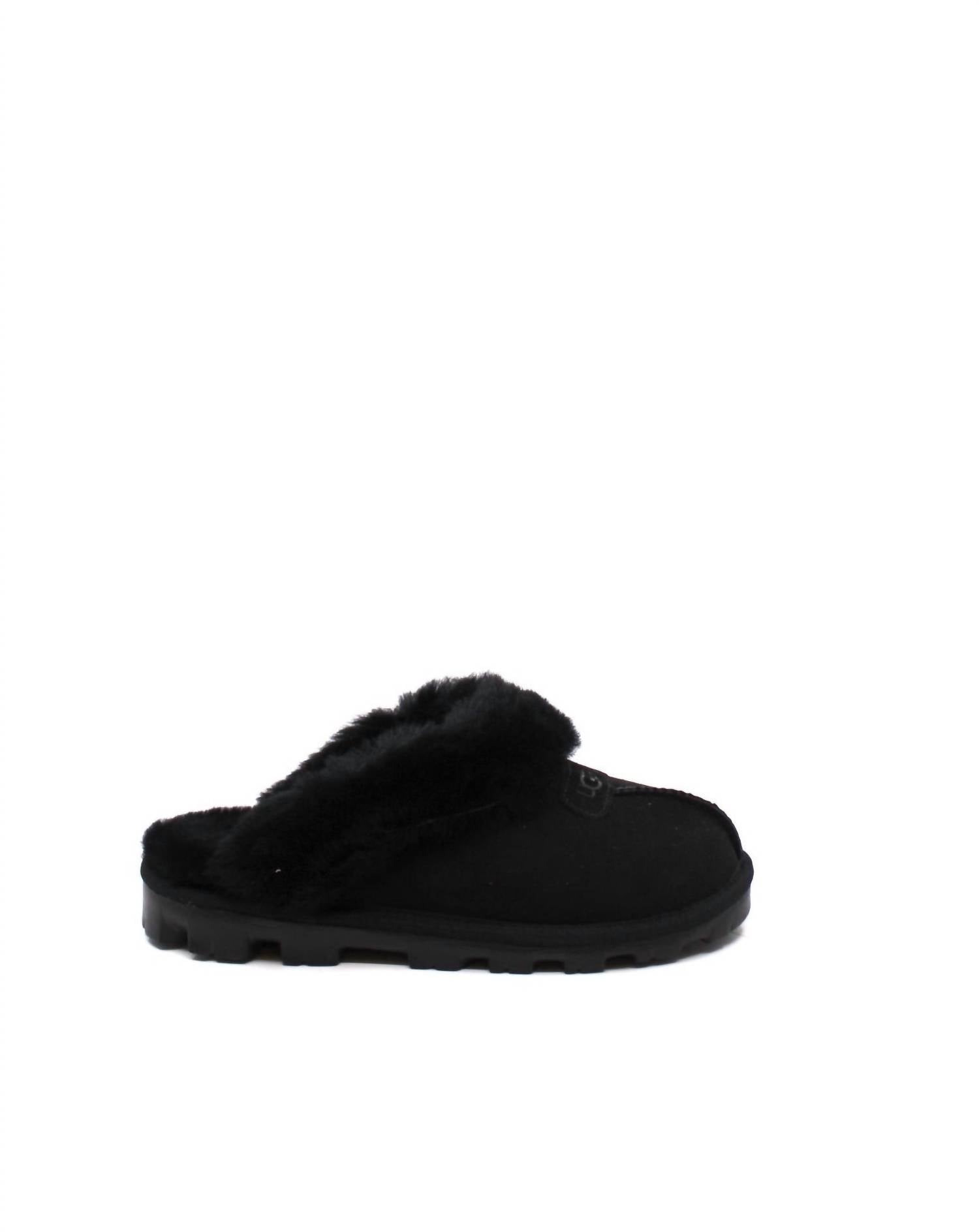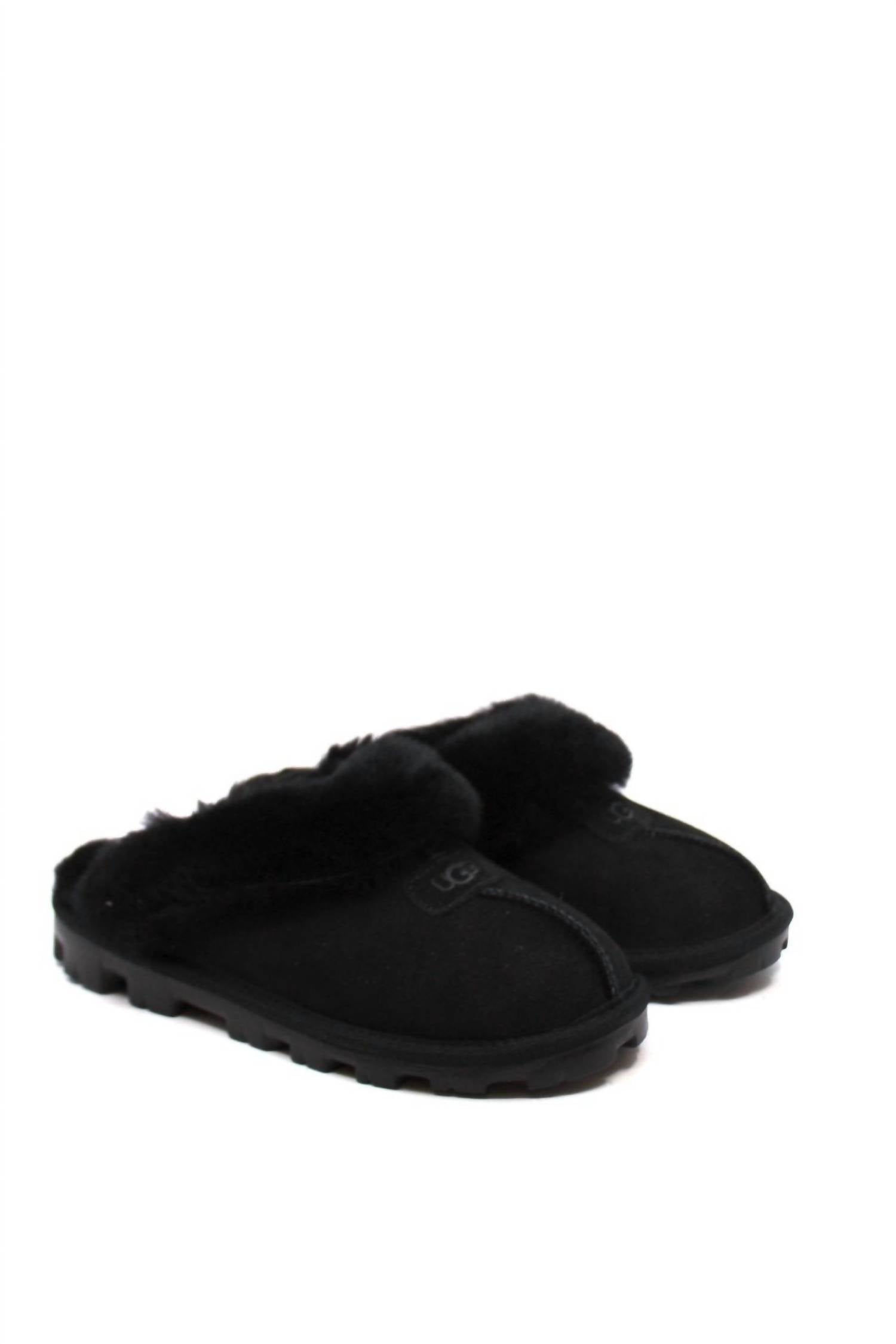 Pair these with a cozy robe and we call this loungewear luxe. Meet the Women's Coquette by UGG, the ultimate slip-on slipper in black that effortlessly combines style and comfort. This backless design is crafted with a 17mm Twinface sheepskin upper and insole, ensuring an indulgent feel with every step. The Treadlite by UGG outsole enhances comfort, while the polyester binding and suede label with an embossed UGG logo add an elegant touch. Ideal for casual outings or lounging at home, these flat-heeled slippers feature a round toe shape, making them both practical and chic.