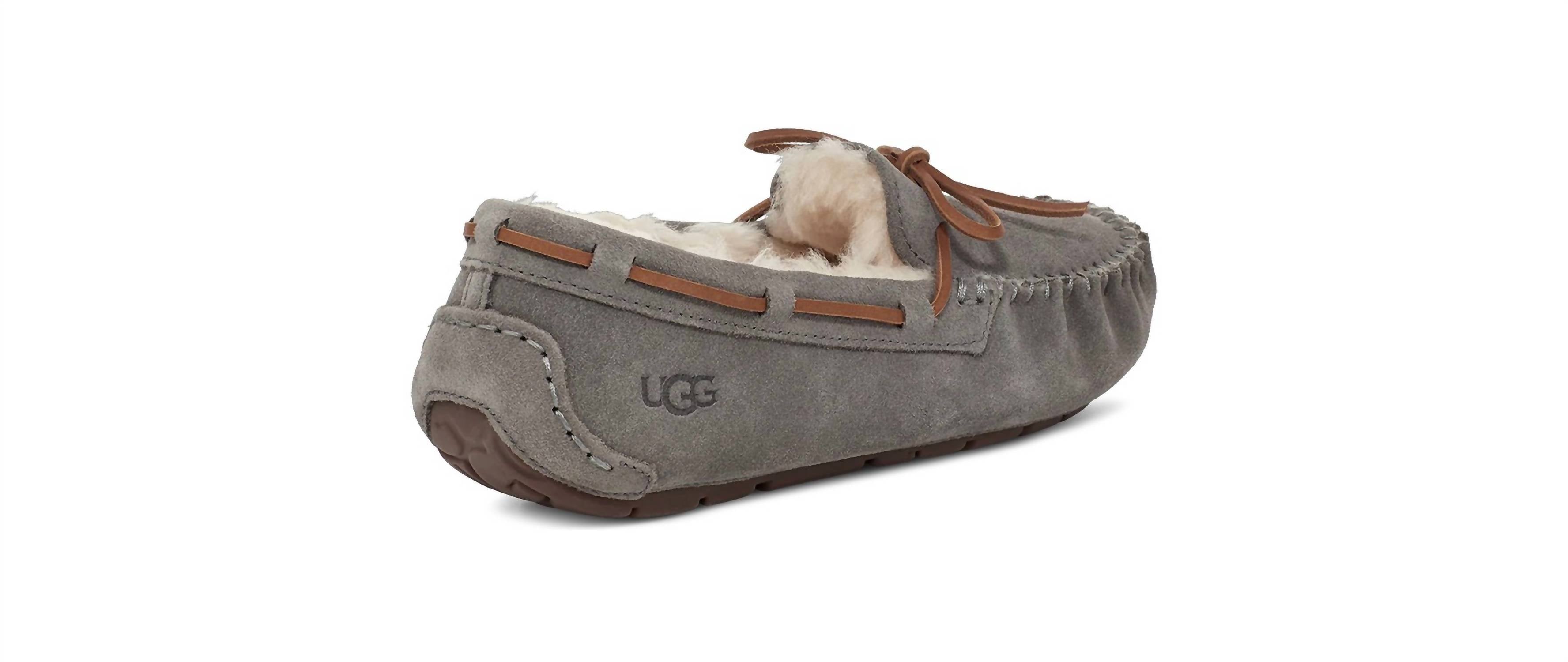 Slip into these, we promise you won't regret it. Step into comfort and style with the Women's Dakota Slipper by UGG, expertly designed in a chic shade. Crafted from water-resistant suede, these slippers feature leather laces and a molded rubber outsole for durability and versatility, allowing for both indoor and outdoor wear. Luxuriously lined with 17mm UGGpure™ upcycled wool or UGGplush™ blend, they offer warmth and comfort synonymous with the brand. Ideal for casual outings or travel, they embody sustainability and empowerment, produced in a factory that supports women through HERproject.