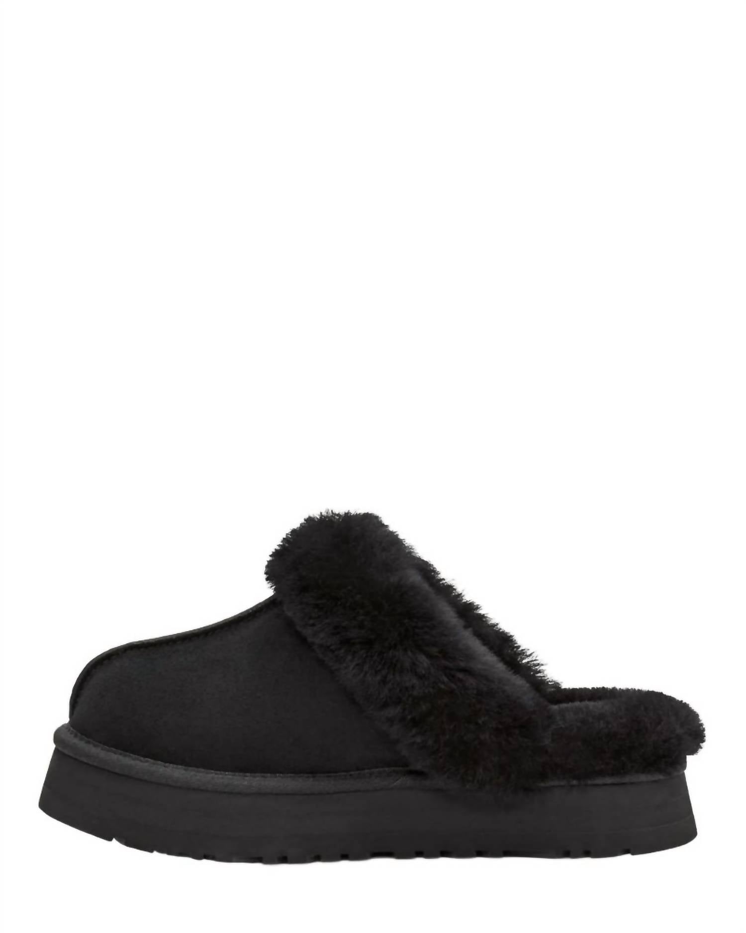 So comfy it's like you're walking on clouds. Slipper features a suede upper adorned with a plush sheepskin collar. Designed with a 17mm sheepskin lining and insole for supreme coziness, it also boasts an EVA midsole and either a Sugarcane EVA outsole or Treadlite by UGG™ EVA outsole for outstanding support. The 1" platform heel offers a touch of lift, complemented by textile binding made from 100% recycled polyester fibers.