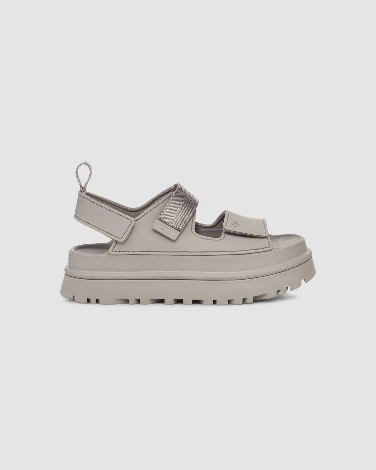 Classicly cute and all-day-wearable. We love this sandal. Step into sustainable style with the UGG Women's Goldenglow Sandal in Seal, featuring an eco-conscious design. This sandal boasts an open toe with a TPU upper and uses 100% recycled polyester fibers for both the rear pull tab and upper lining textile. The quarter strap webbing also stands out with its use of 100% recycled polyester fibers, all secured by a hook-and-loop closure. Walk comfortably with the sugarcane EVA midsole and outsole, maximizing both support and environmental responsibility.