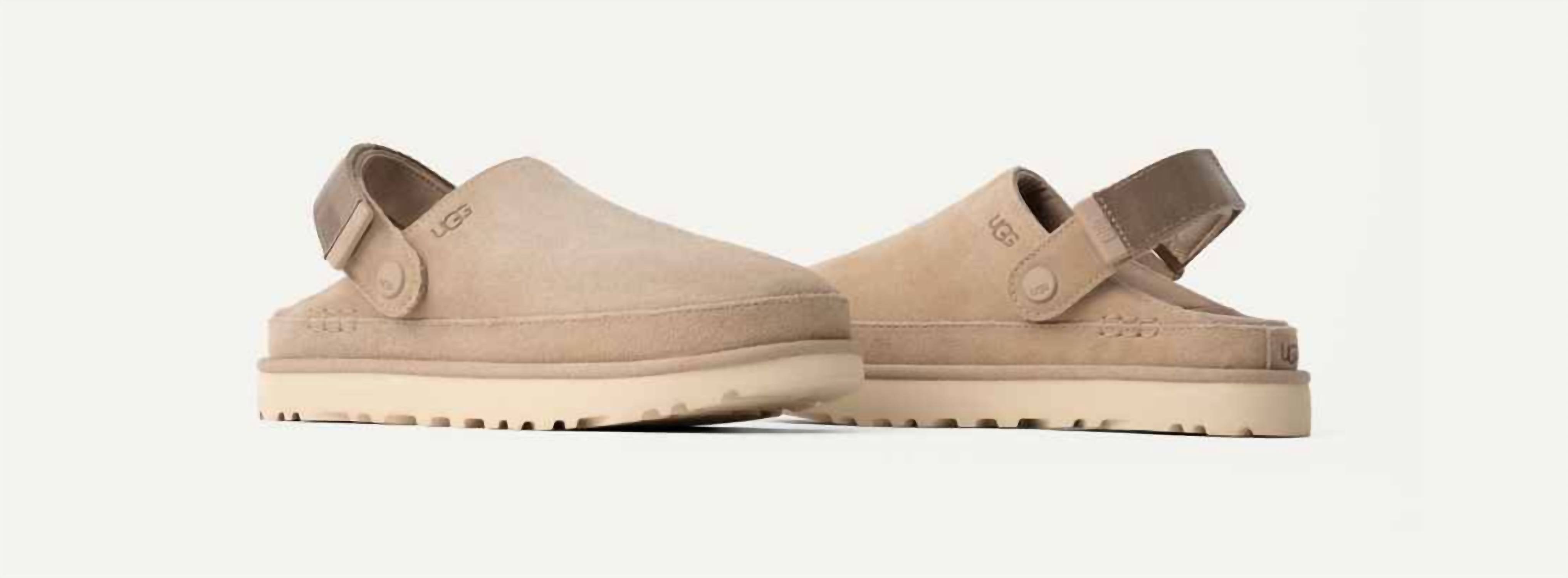 Slip them on and go! Crafted from velvety suede, this versatile clog offers a wear-with-everything style. If you are reaching for a clog, you'll want comfort, and our Goldenstar Clog delivers! The heel strap features a swivel design for a 2-in-1 wearing option — wear it as a heel strap or stacked on top for an easy on/off, open back option. An ultra-lightweight outsole provides all-day cushion and support. The outsole of this product is a sugarcane EVA outsole, which is a responsible compound using sugarcane foam that allows us to reduce dependency on fossil fuels by replacing petroleum-based ethylene. Item No. 1138252 Suede upper Webbing heel strap Adjustable heel strap, Hook-and-loop closure, TPU strap end with The Graphic UGG® Font Textile lining made from 100% recycled polyester fibers The sockliner textile is made with 100% recycled polyester fibers Contoured EVA footbed Sugarcane EVA midsole made with recycled EVA regrind Sugarcane EVA outsole Recycled polyester binding The UGG® Logo, embossed RN 88276