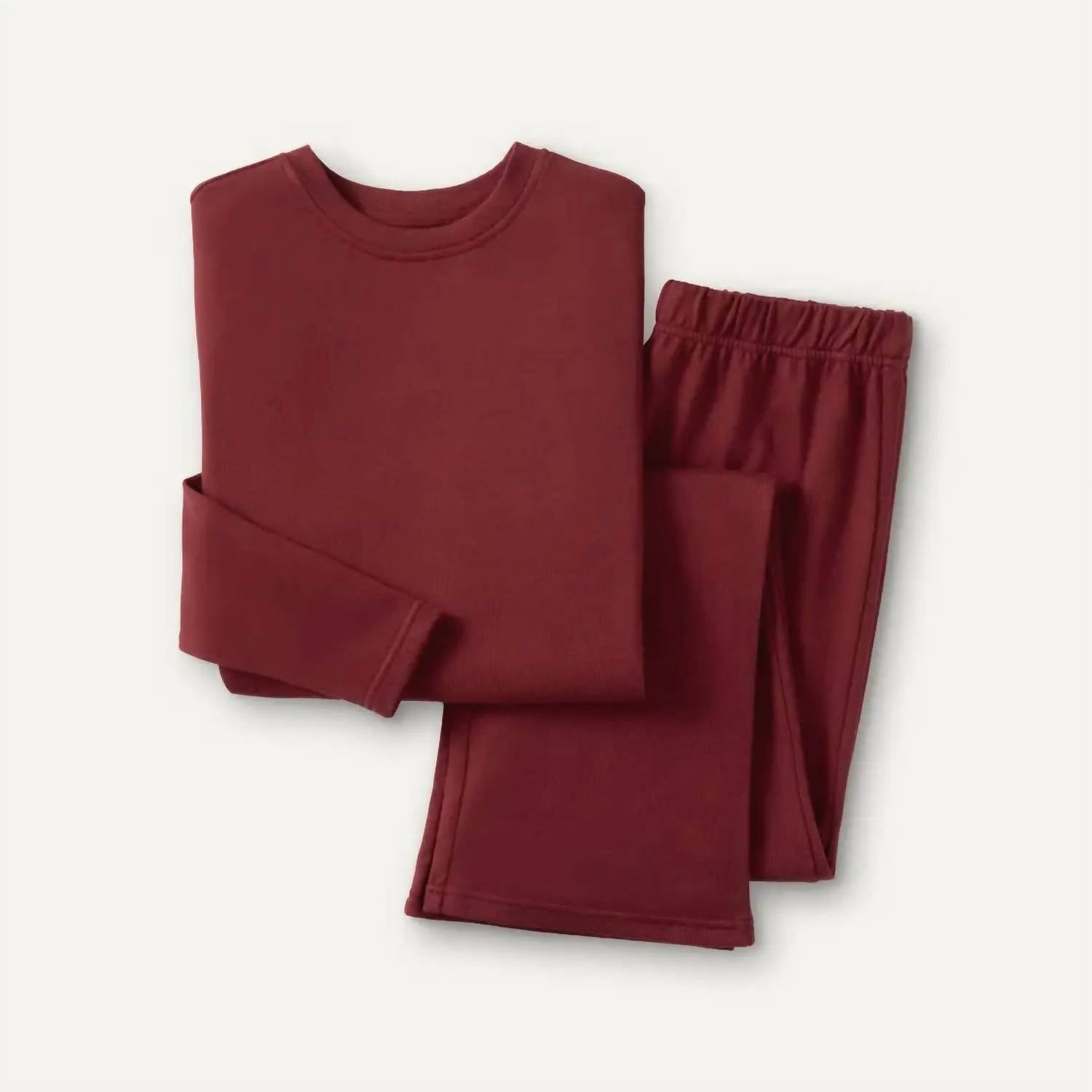 A match made in heaven. This two-piece set is so cute, you'll wish you could wear it out of the house! Did we mention how comfortable it is, too? You may want two sets! Introducing the UGG May Loungewear Set, a chic ensemble that redefines comfort with its asymmetrical long sleeves and relaxed fit. Tailored from 96% recycled polyester and 4% elastane, this set offers a sustainable yet luxurious feel in a rich rubious hue. The cropped top pairs effortlessly with elastic-waist, wide-leg pants for versatile styling options. Enjoy eco-friendly elegance and unparalleled softness, machine washable with care to lay flat to dry. Model wears: Small.