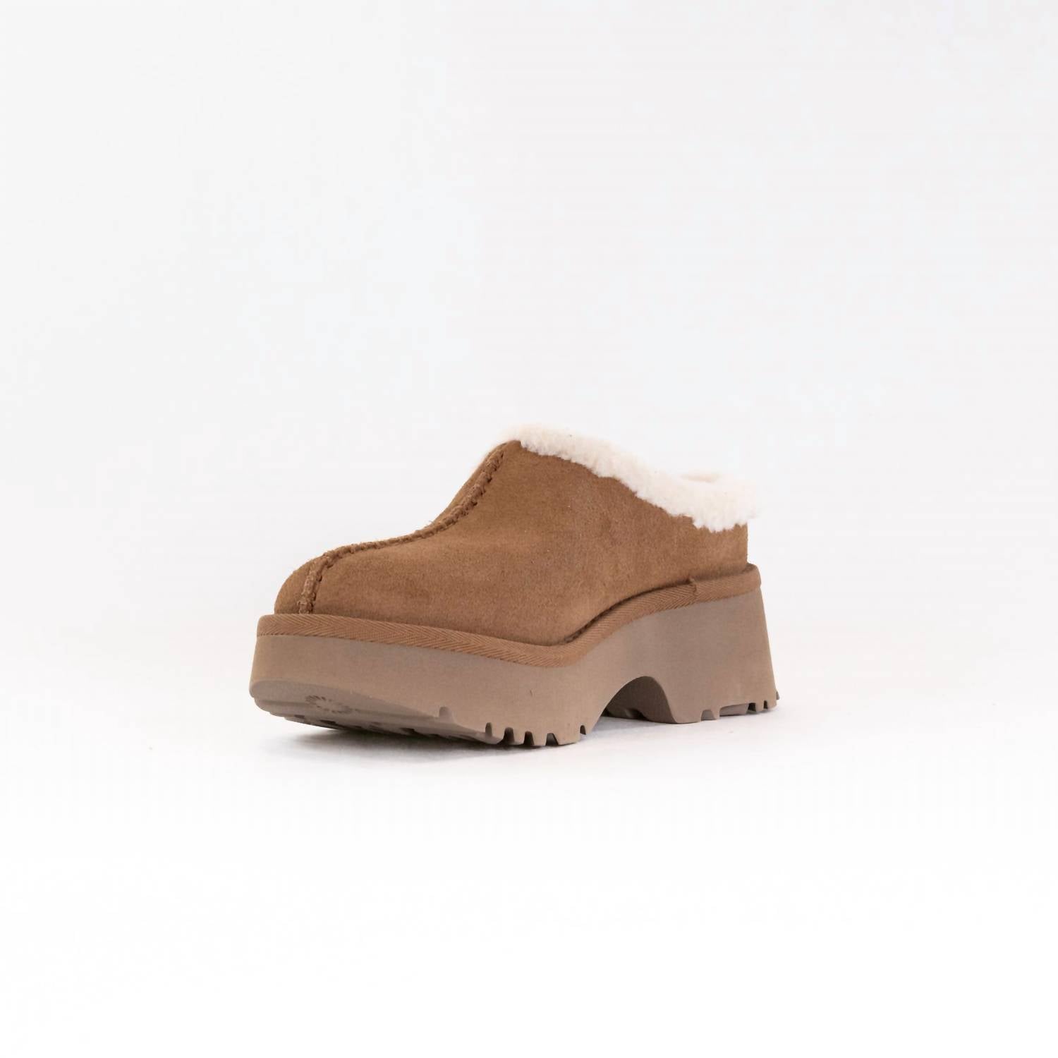 Stylish, comfy, and versatile. We can't find anything wrong with these. Discover the Women's New Heights Cozy Clog Shoes by UGG, where comfort meets style. Crafted in chic chestnut suede, these clogs feature Twin Seam detailing and are lined with upcycled UGGplush for warmth, perfect for winter outings or a Thanksgiving dinner party. Designed with a 2-inch platform heel, a foam footbed, and a lightweight EVA outsole, they offer both style and support. Embrace minimalist trends with this versatile addition, suitable for cottage or metropolis settings.