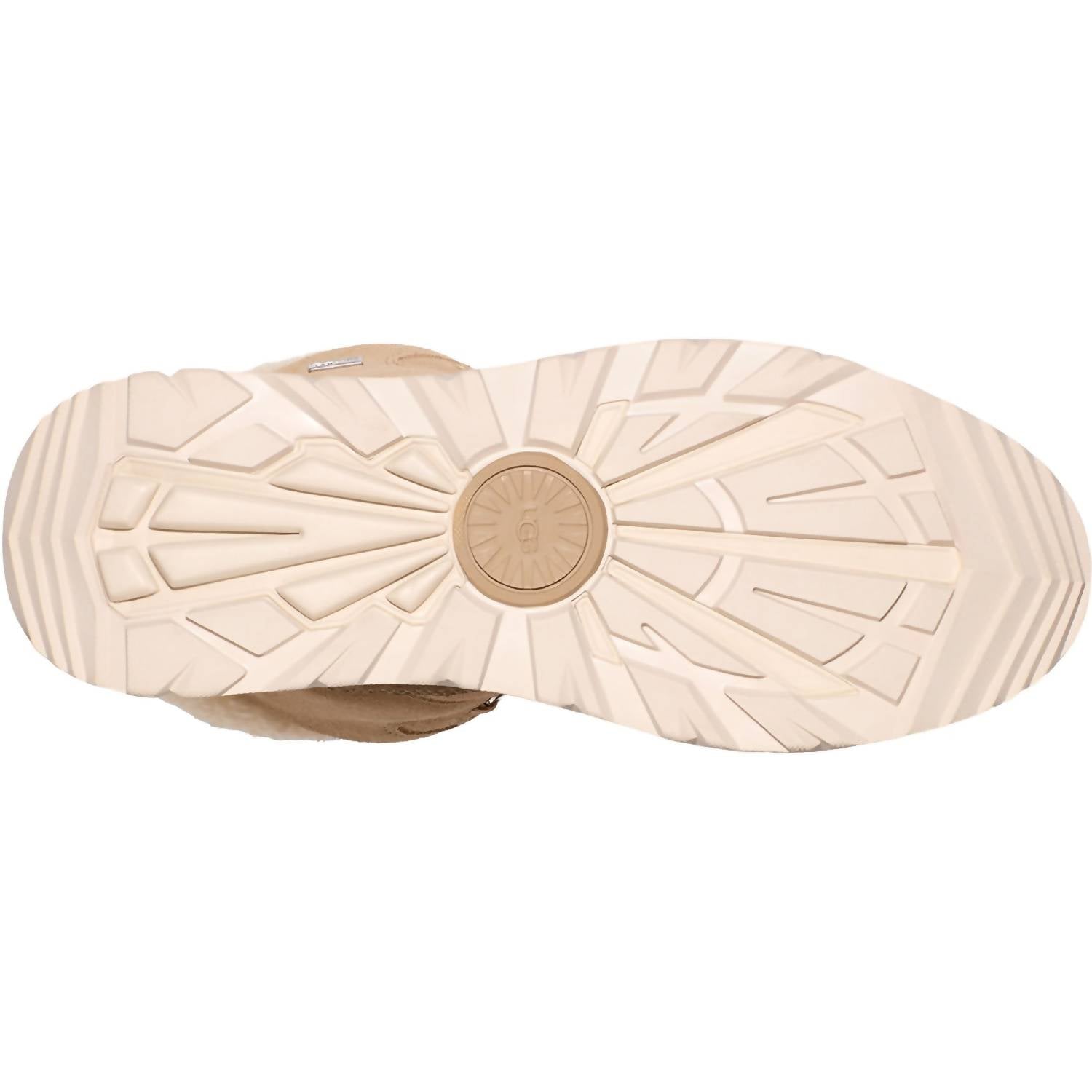 Rainboots so cute, you'll want to wear these even on the lightest drizzle days. Introducing the Women's Terretrail Cozy Lace Boots by UGG, a perfect blend of comfort and functionality for the winter season. Crafted from waterproof suede with a chunky heel height of 2.7 inches, these sand-colored boots feature a gusseted tongue and a cozy padded collar. With a Spider Rubber® outsole providing exceptional traction, they're ideal for light rain or snow. Embrace eco-friendly style with recycled polyester laces and a UGGplush sock lining.