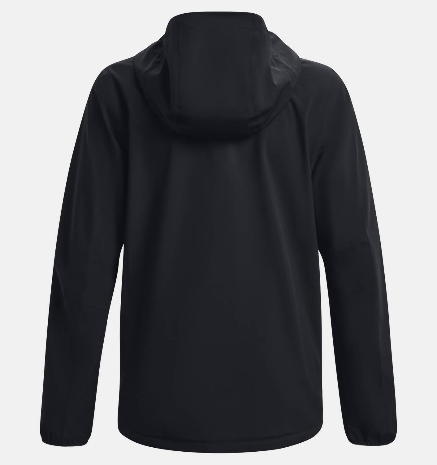 Designed for the ultimate training experience even in the harshest weather. Long-sleeve utility jacket. Boasts 100% polyester fabric. Enhanced with waterproof, windproof, and breathable properties, all while maintaining superior flexibility with its 4-way stretch material. Featuring a convenient full zip closure and packable into its right-hand pocket for easy portability. Enhanced with UA Storm technology and a dropped. Shaped hem with a bungee adjust for a custom fit. Garment should be washed & dried zipped up. Machine wash cold with like colors. Do not bleach. Tumble dry low. Do not iron. Do not use softeners. Do not dry clean.