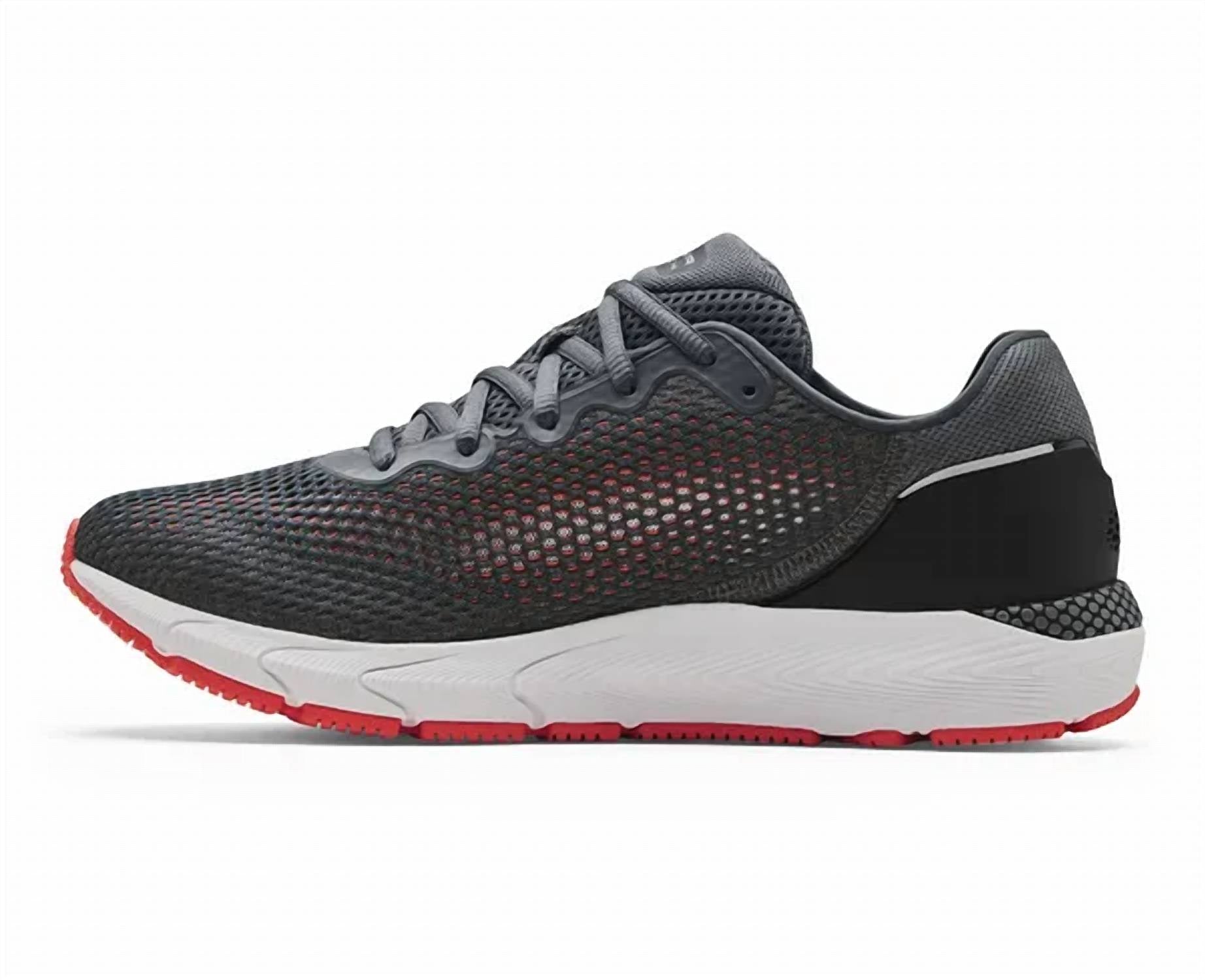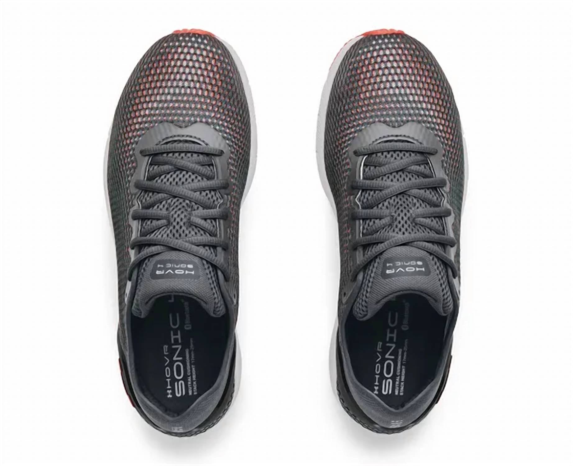 Step into enhanced performance with the UNDER ARMOUR Men's Hovr Sonic 4 Running Shoe, designed for the modern runner who values both comfort and innovation. These sneakers feature an engineered mesh upper providing lightweight breathability, while the one-piece heel construction with an external TPU heel counter offers additional support. The shoe is equipped with UA HOVR cushioning which minimizes impact and returns energy with every stride. With an 8mm offset and weighing just 9.92 oz, these gray/red sneakers include standard tie laces and are ideal for neutral runners seeking flexibility and cushioning.