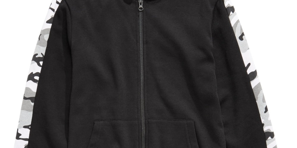 Hood; full-zip front closure|Split pouch pocket at front|Contrast camouflage panels at sleeves; ribbed-knit cuffs and hem|Cotton/polyester|Machine washable|Imported