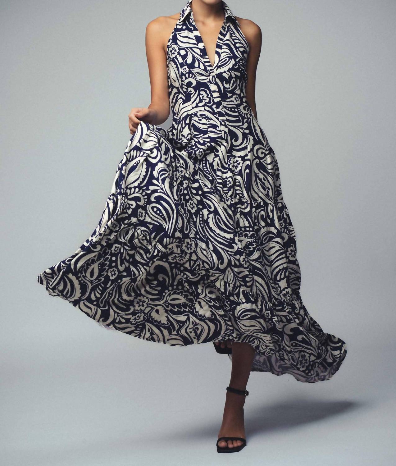 Style this maxi with your favorite statement necklace and sandals for the perfect look. Introducing the Urban Daizy Halter Tiered Maxi Dress, a stunning choice with its abstract floral pattern in elegant navy. This sleeveless dress features a sophisticated halter neckline with a plunging V-front, complemented by an open back design. Created from 83% Rayon and 17% Nylon, this maxi dress is both comfortable and stylish, perfect for summer evening events or holiday getaways. Easily maintain its chic A-line silhouette with machine wash care, and enjoy the effortless pull-on closure for a seamless look.