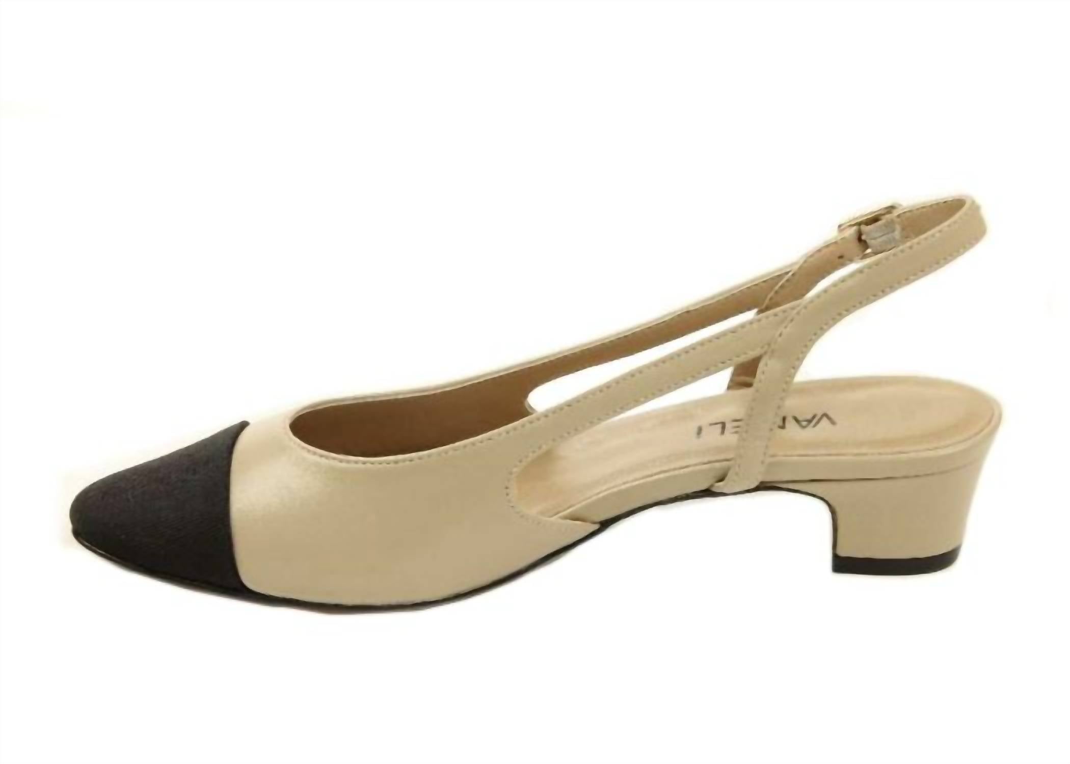Classicly cute and all-day-wearable. We love this sandal. Step into sophistication with the Women's Aliz Pudding Sandal by VANELi, a chic addition to your spring workwear wardrobe. This beige and black slingback features an adjustable buckle and stylish cap-toe detail, accented with a block heel that measures a comfortable 1.25 inches. The buffed leather sole, enhanced with a rubber insert, ensures reliable traction for your engagement or professional events. Ideal for adult women, this versatile sandal seamlessly blends style and practicality.