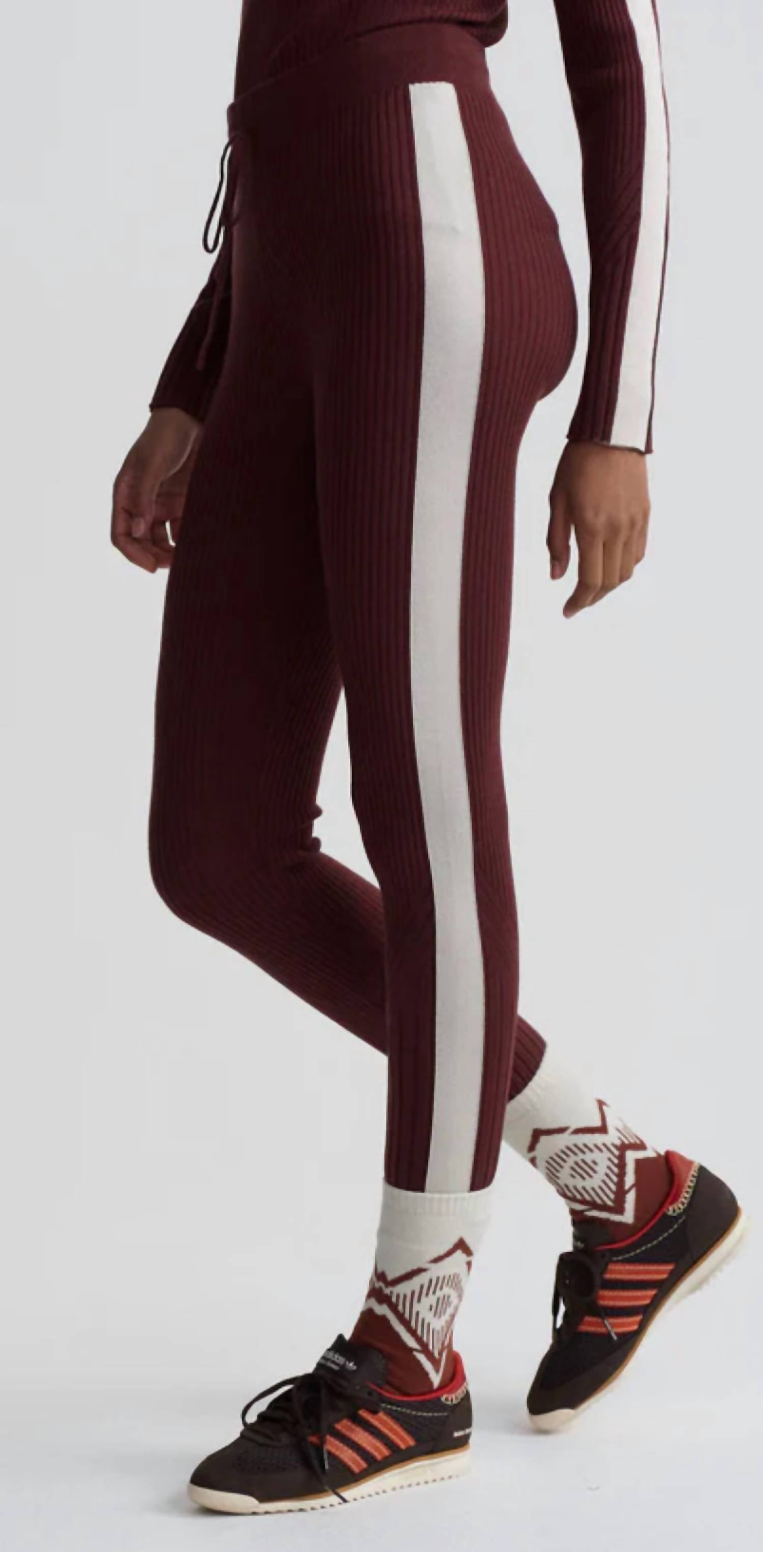 You'll be reaching for this best-selling legging all season long. Introducing the Aiden Knit Legging by VARLEY, designed to keep you warm in style, whether on the slopes or off. This Red Chocolate essential is crafted from a soft viscose blend featuring a flattering high-rise, contrasting stripe side panels, and a comfortable tie closure. Ideal for women seeking a slim fit, its skinny leg design ensures a sleek silhouette. Care instructions include machine washing and laying flat to dry, making maintenance a breeze.