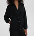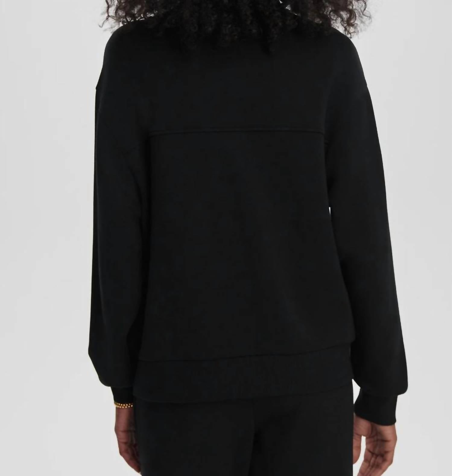Introducing the Varley Celeste Button Through Sweatshirt in classic black, crafted from a luxurious Viscose Blend for a soft, cozy feel. This cardigan-style sweatshirt features long sleeves and a modern V-neckline with tonal button closure, creating an effortlessly chic look. Made in the USA, the relaxed fit is characterized by dropped shoulders and a front length of 24.2" in size S. For best results, dry clean only. Perfect for fall workwear or travel occasions.