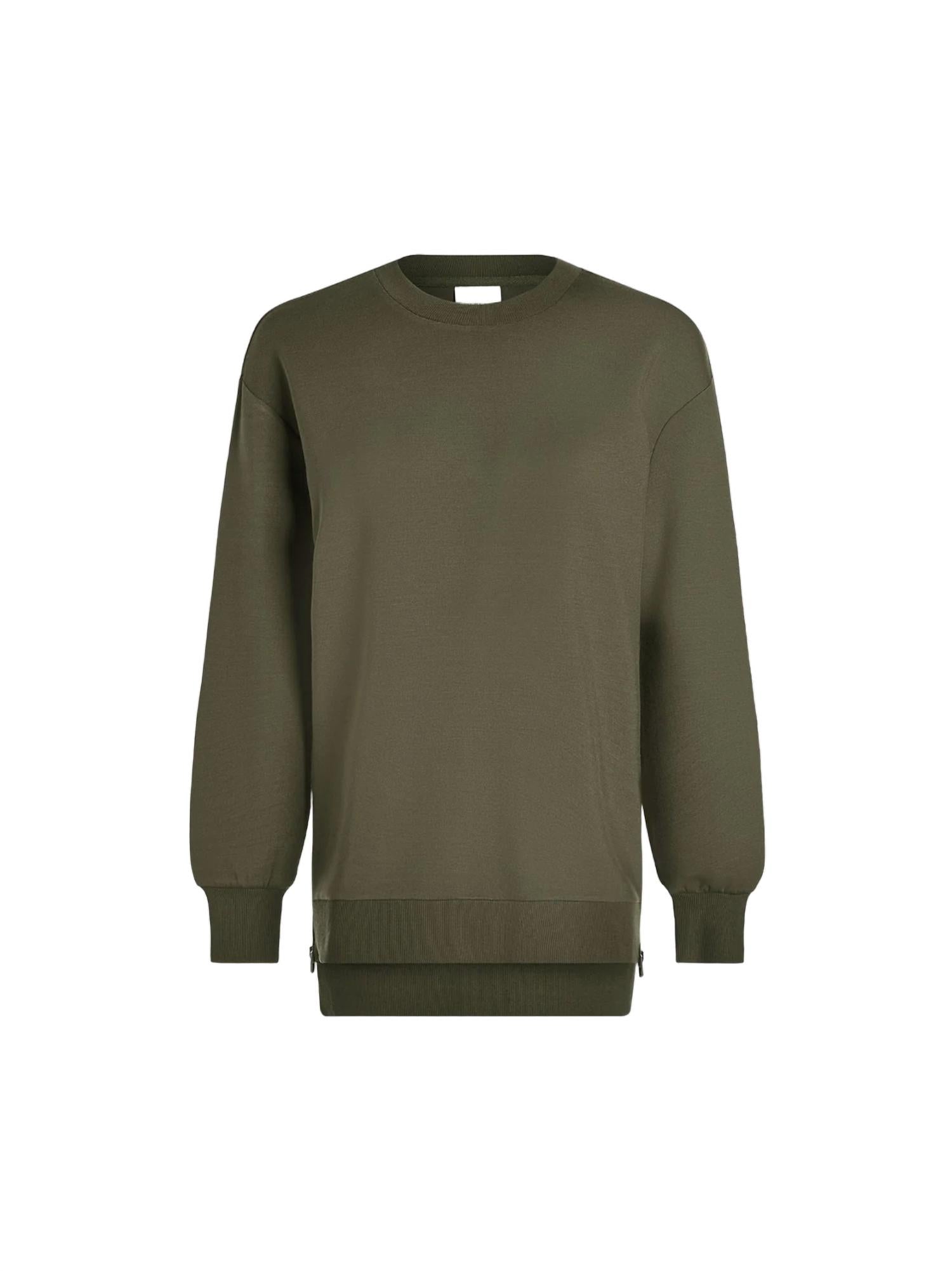 Relaxed fit sweat boasts elevated metal side zip detailing and a dropped back hem. Cut to a longline silhouette. Model is 5'9.5" wearing size Small. Fabric: 72% Viscose, 23% Polyester 5% Elastane. Machine wash cold.