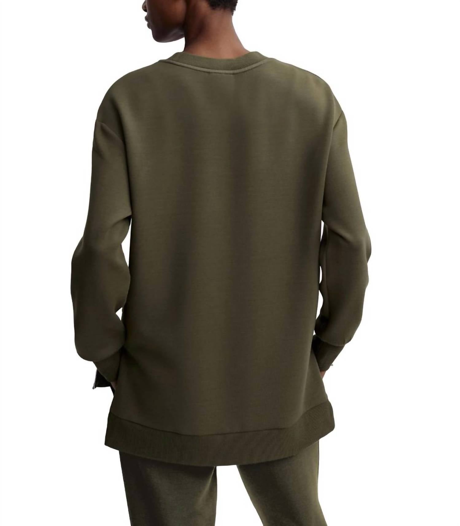 Whether you're running around town or lounging at home, this sweatshirt works for both. Relaxed fit sweat boasts elevated metal side zip detailing and a dropped back hem. Cut to a longline silhouette. Model is 5'9.5" wearing size Small. Fabric: 72% Viscose, 23% Polyester 5% Elastane. Machine wash cold.