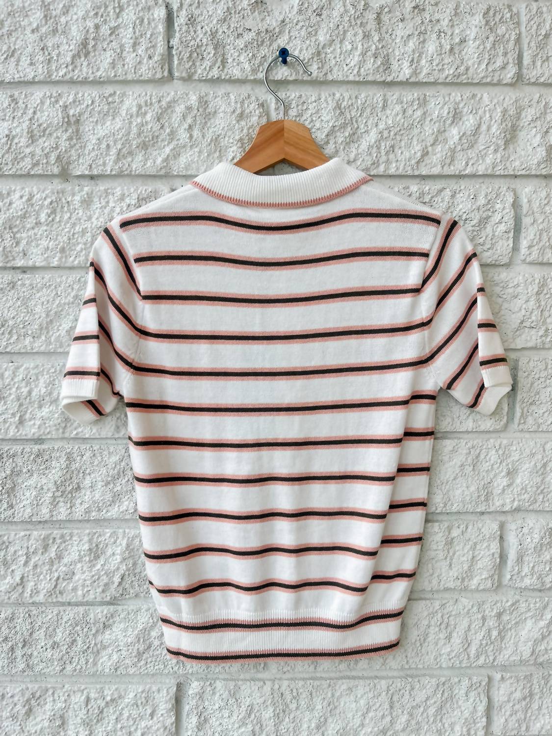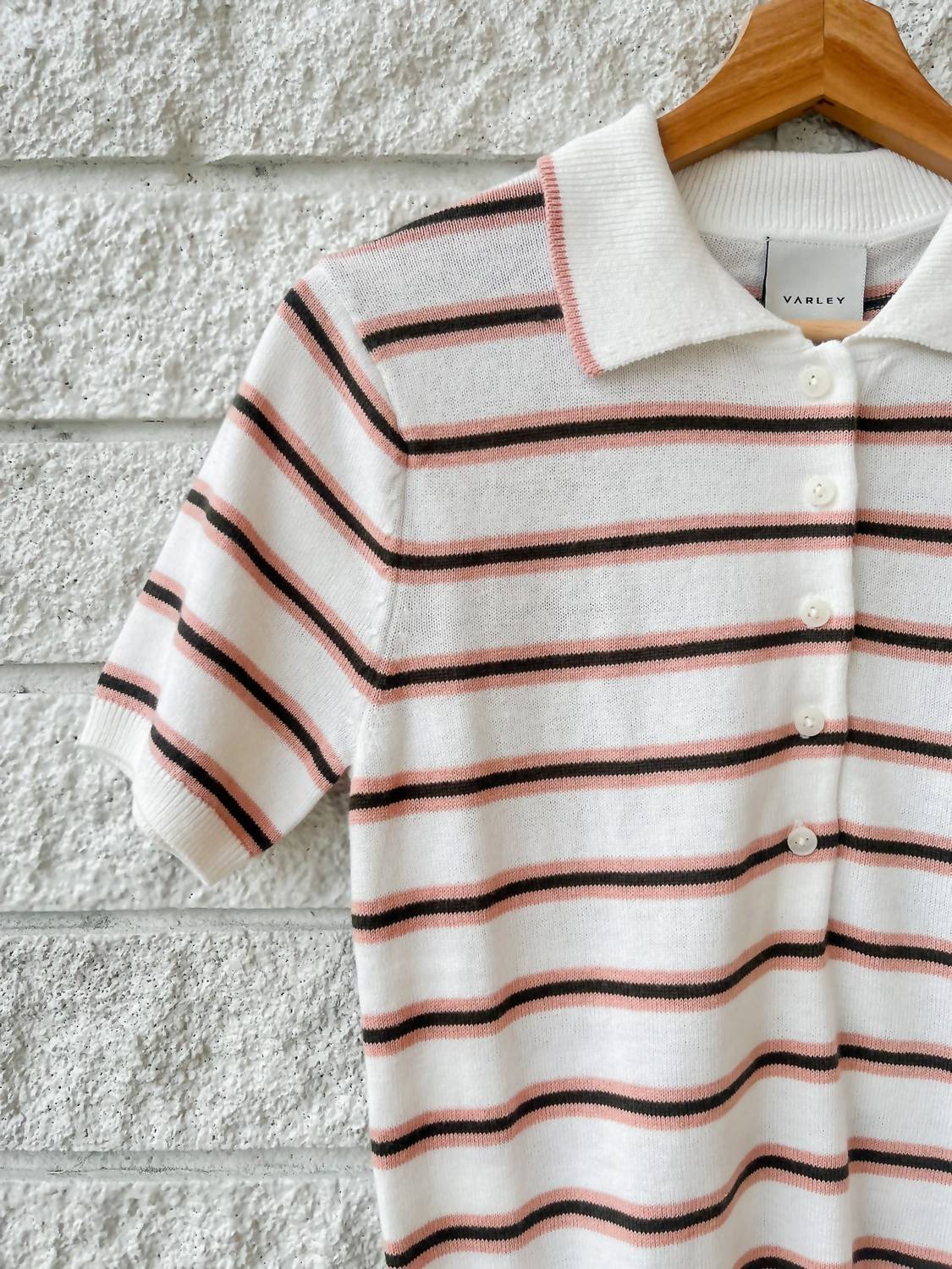 A timeless blouse that will never go out of style. Introducing the Faustine Button Neck Polo by VARLEY, a stylish addition to your wardrobe perfect for spring vacations. This polo features a five-button closure and is crafted from a comfortable cotton blend, consisting of 60% cotton and 40% polyester. Designed with short sleeves and a classic collar in a chic White Pink Ivy Stripe pattern, this imported blouse adds a fresh touch to your outfit. With its simple, pocket-free design, it's as practical as it is fashionable.