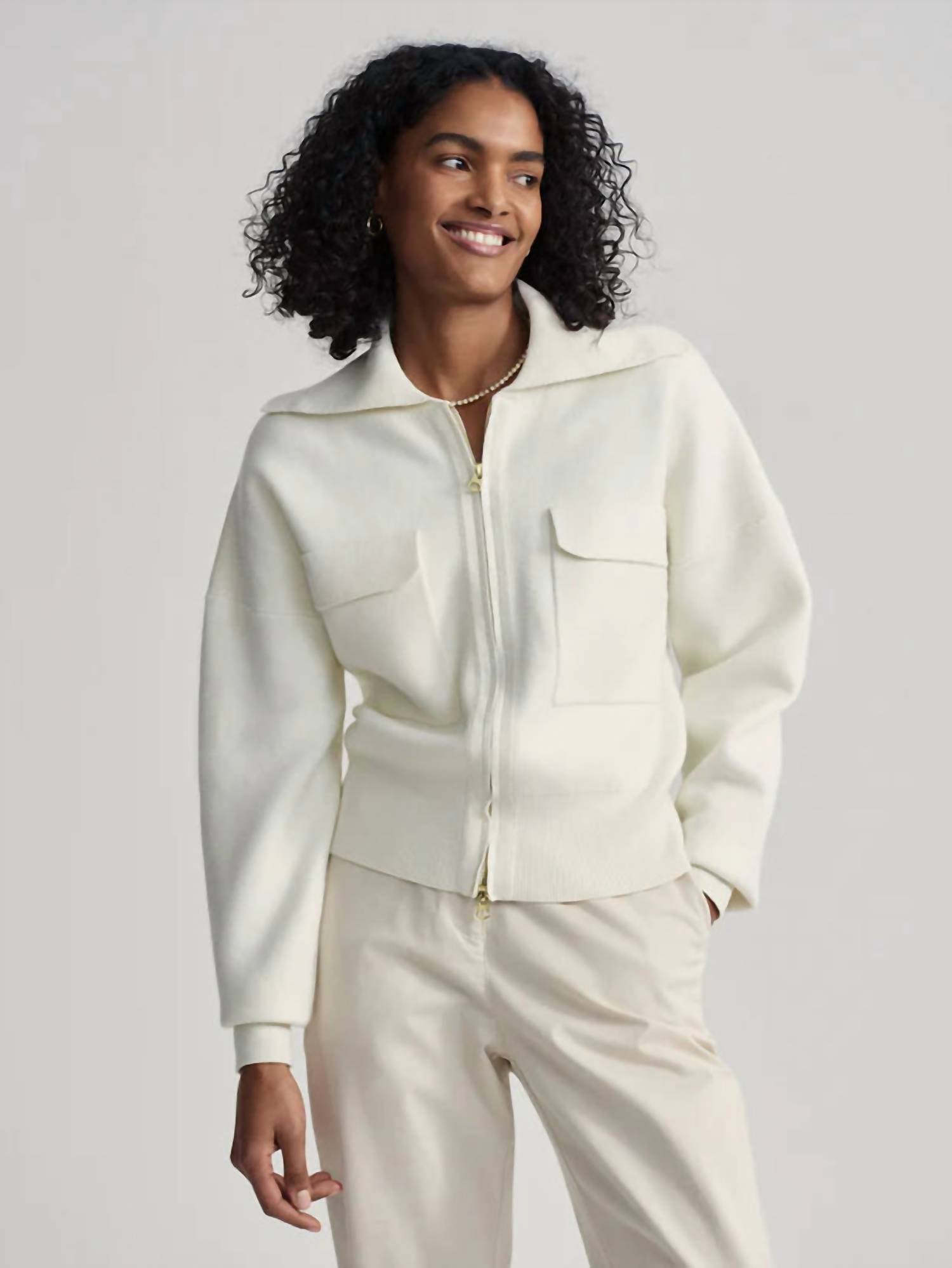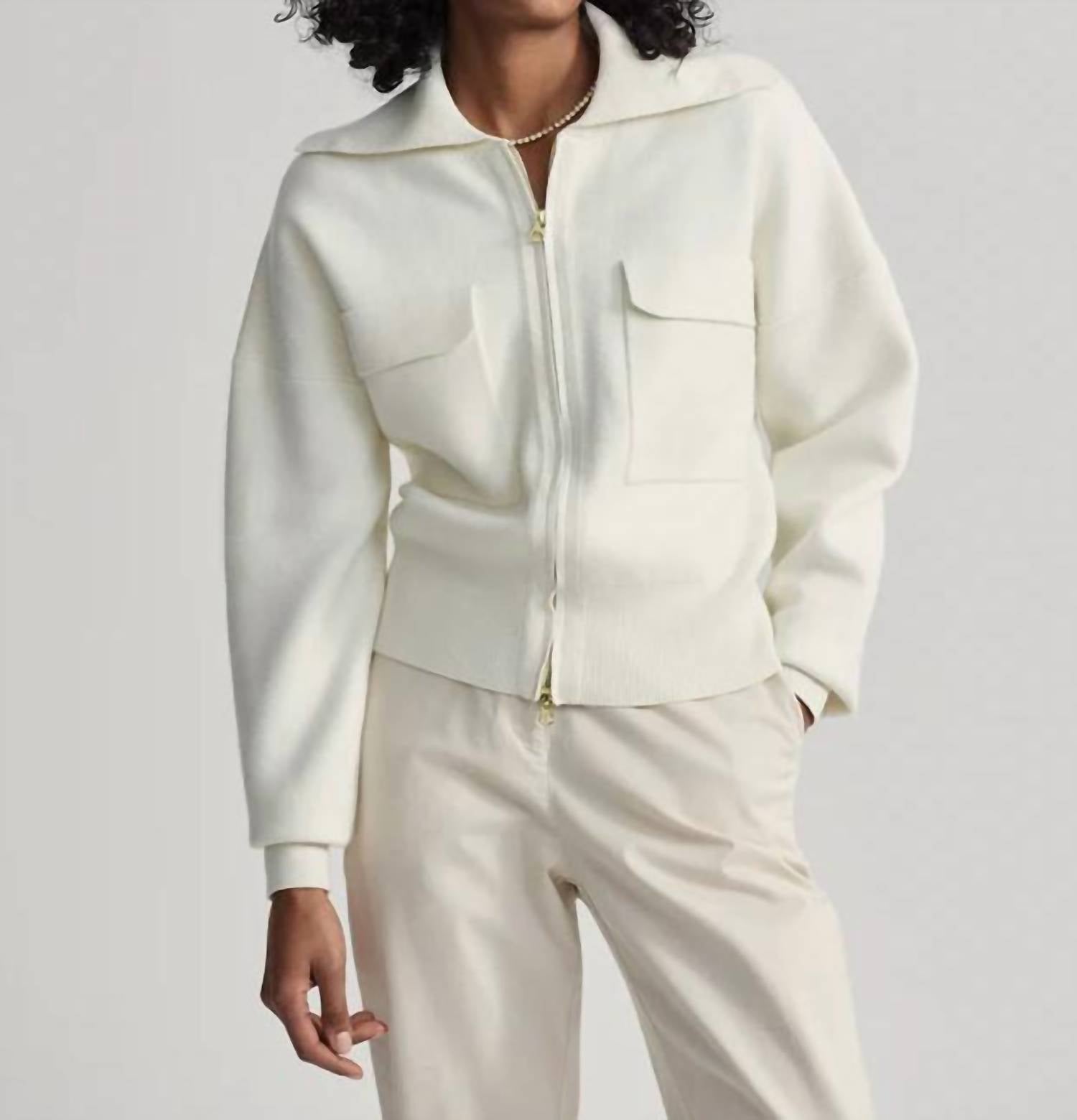The perfect long sleeve tee that goes with just about anything. Introducing the Felise Relaxed Knit Sweater by VARLEY, perfect for fall occasions with its modern, utilitarian design. This long sleeve jacket is crafted from plush full needle knit, featuring a relaxed fit with drop shoulders and practical patch pockets. Designed in a pristine white, it includes a zip closure and stylish collar detail. Ideal for church gatherings, this versatile piece blends comfort and style seamlessly.