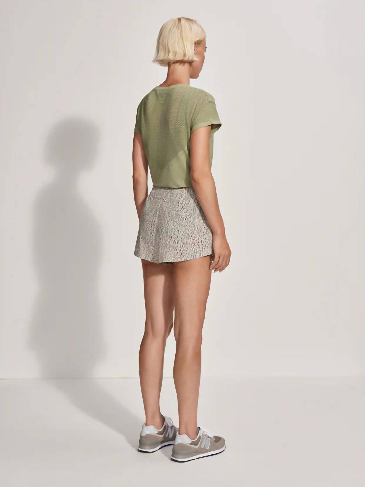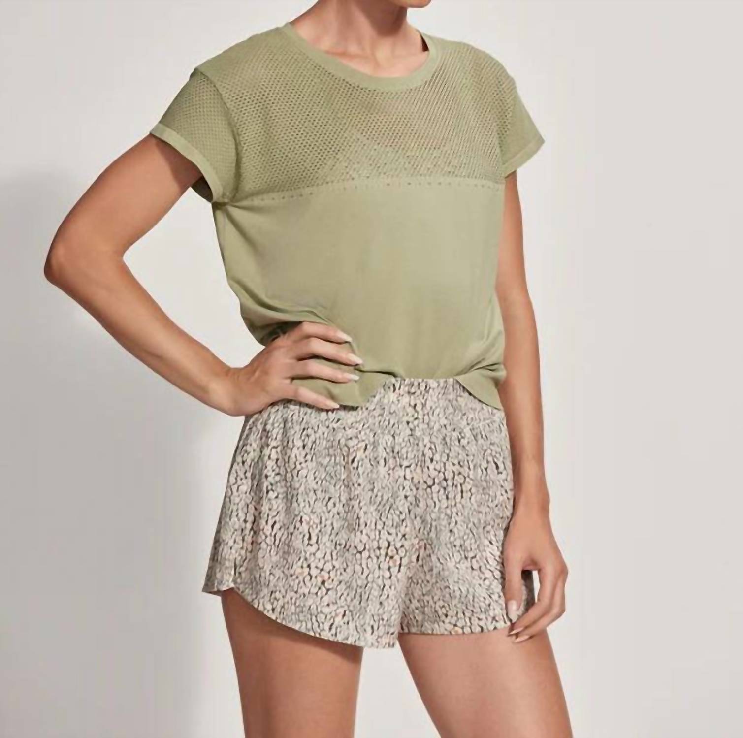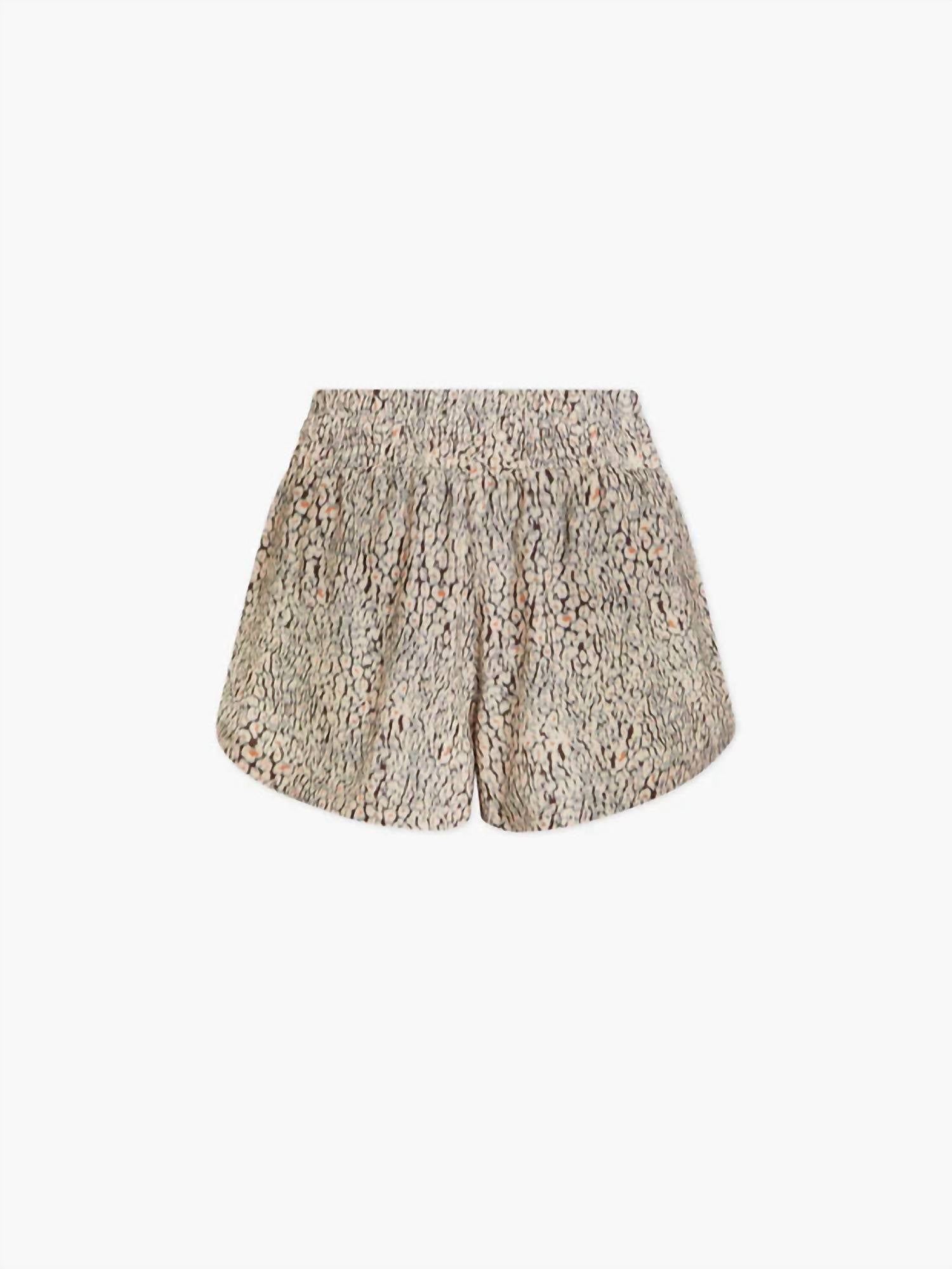 Tuck your favorite tee into these high-waist shorts for a more casual-cool feel. Introducing the Kallin Running Short by VARLEY in a playful Seagrass Abstract Cheetah print, ideal for a Boho Chic look. Designed with a deep, comfortable waistband to sit high on the hips, these shorts include a convenient pocket and draw cords for added functionality. Crafted primarily from a blend of 86% Polyester and 14% Elastane, with an inner lining of 95% Polyester and 5% Elastane, they offer both durability and stretch. Closure: Tie closure. Care: Machine wash cold with like colors, line dry, do not tumble dry or iron.