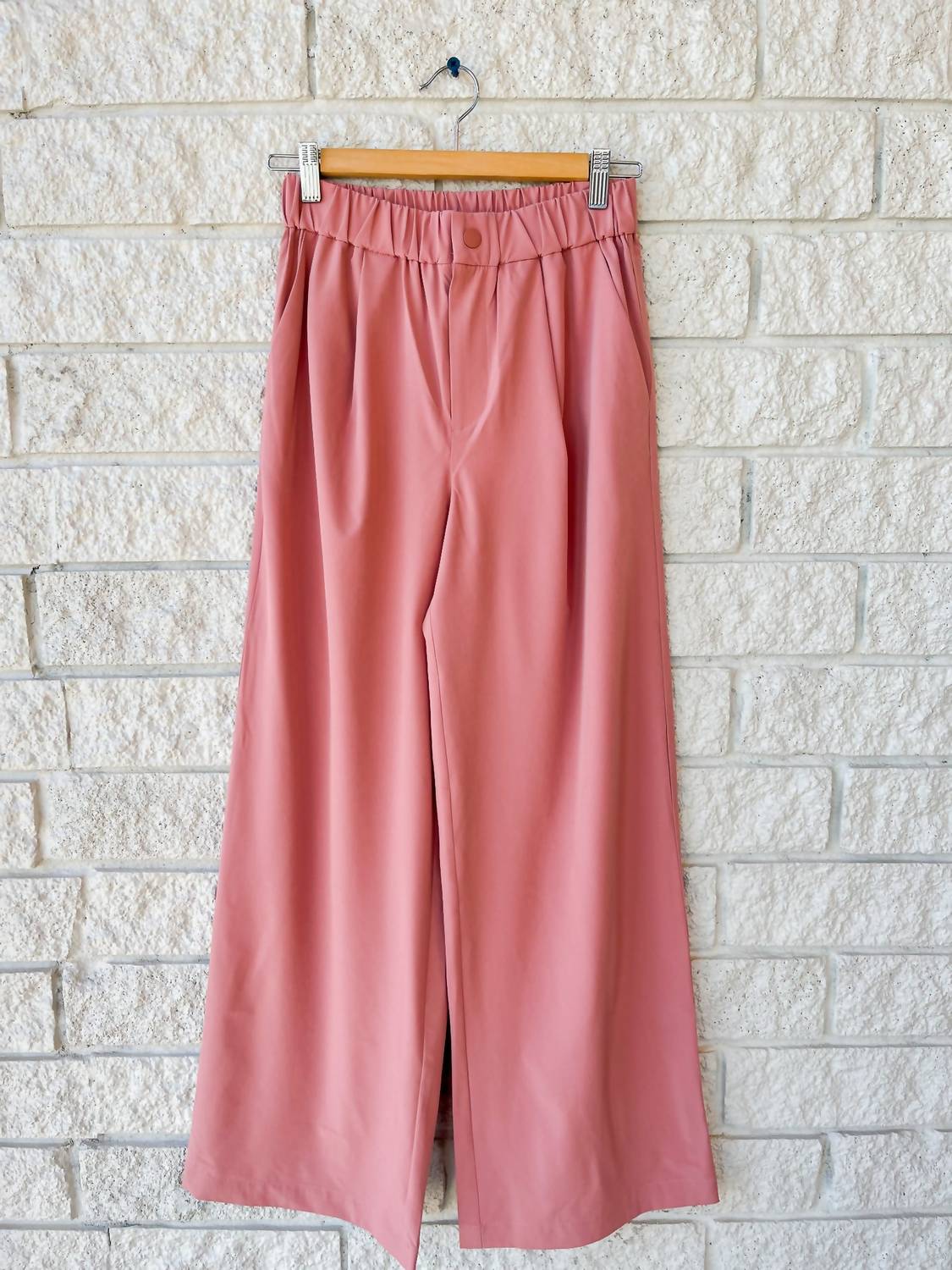 Introducing the Kayson Wide Leg Pant by VARLEY, a chic addition to your wardrobe in a sophisticated Ash Rose. Designed with an elastic waist band for comfort, these pants also feature striking front pleat detailing. Crafted from 86% recycled polyester and 14% elastane, they offer a relaxed fit perfect for a spring baby shower or any casual occasion. Closure type: Button closure.