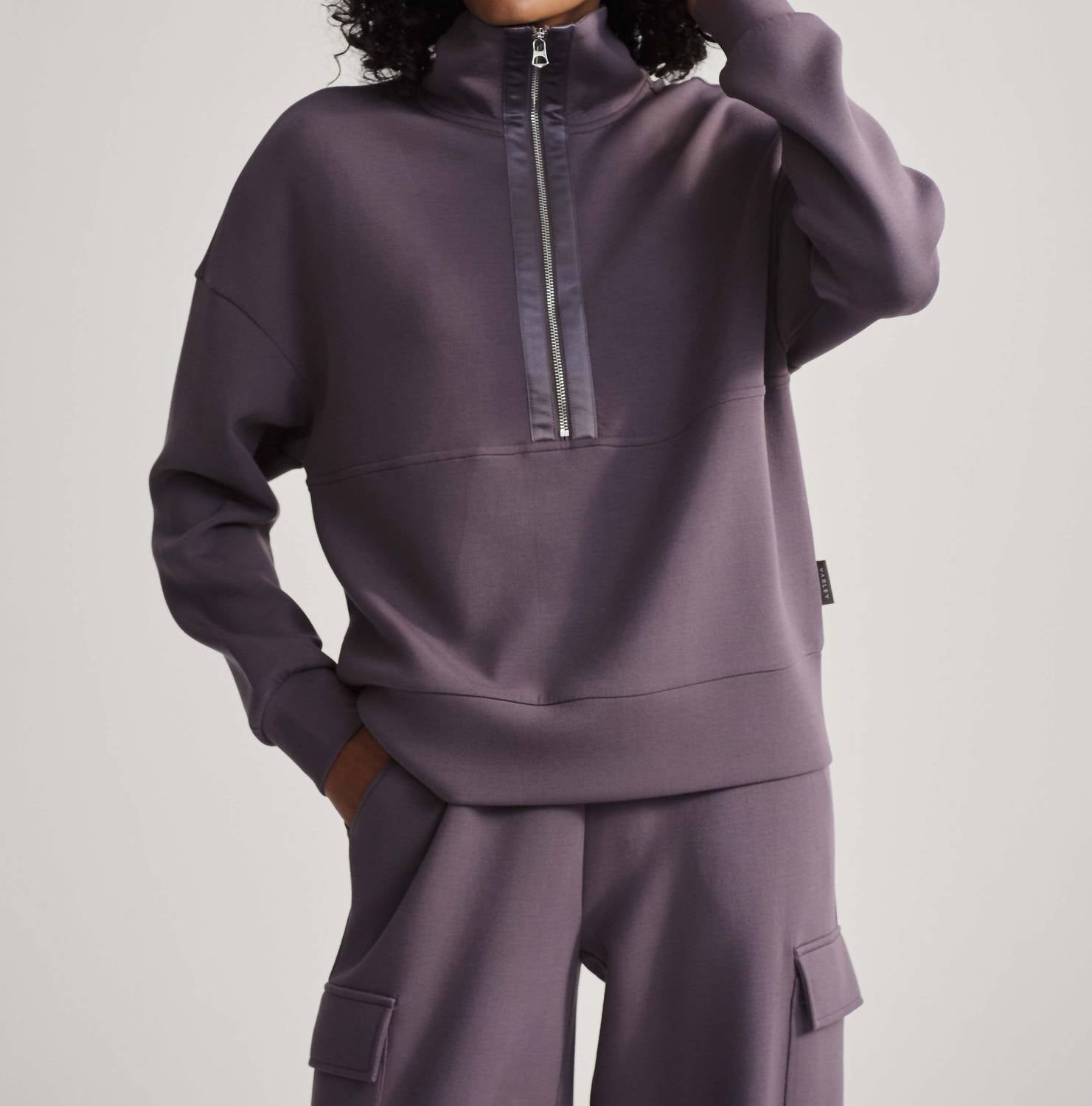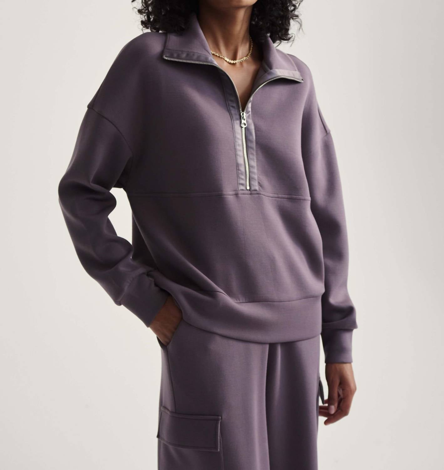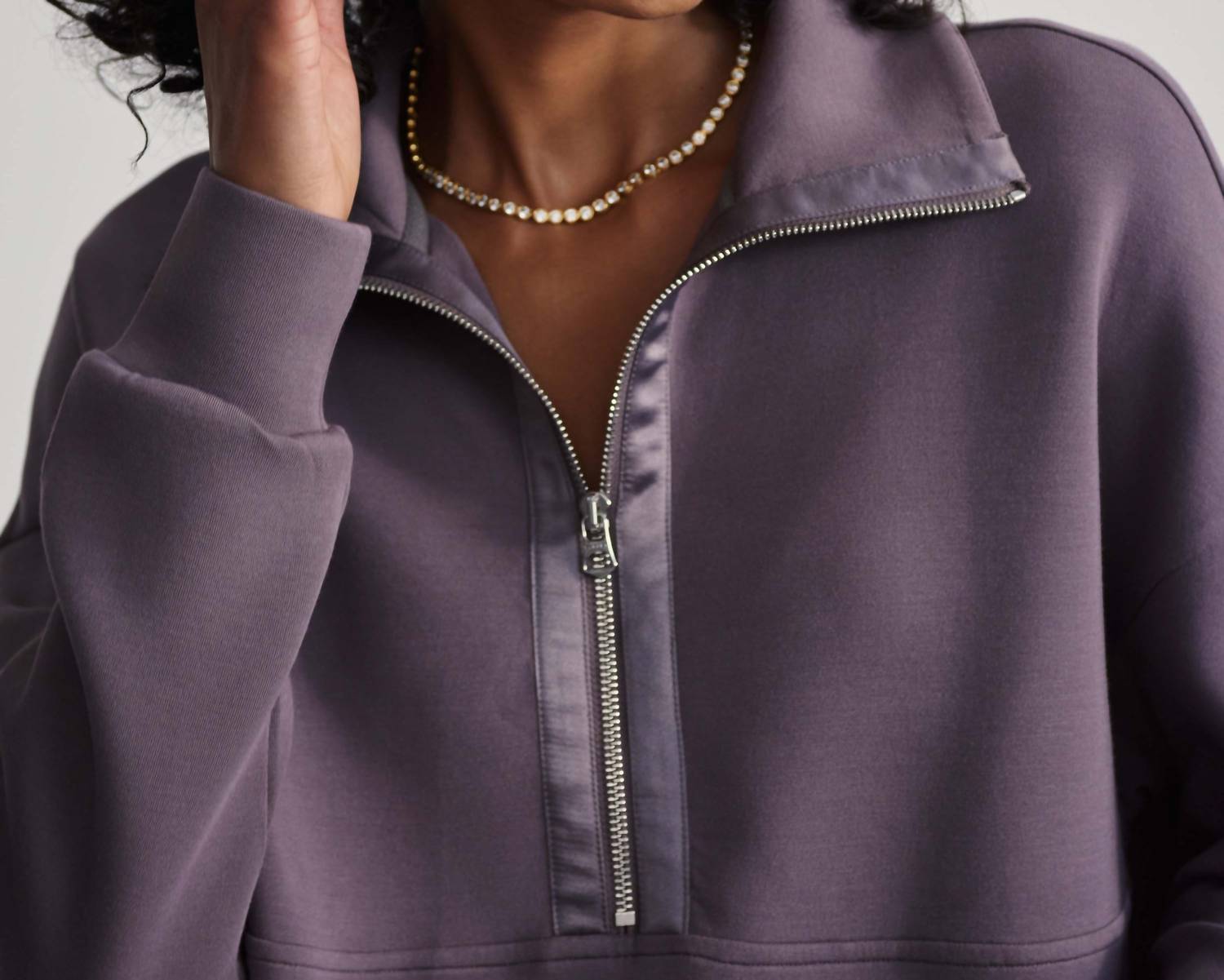 Cooler temps call for layering and we love this adorable sweatshirt for all the obvious reasons. Boxy silhouette sweat with drop shoulders and sateen trim detailing. Made from year-round DoubleSoft® fabric. 72% viscose, 23% polyester, 5% elastane. Machine wash cool on gentle cycle. Do not bleach, tumble dry, or dry clean. Cool iron. Take your true size for a standard boxy fit. Style #VAR01568. Size Small - Front Length: 23.6 inches. Sleeve Length: 19 inches.