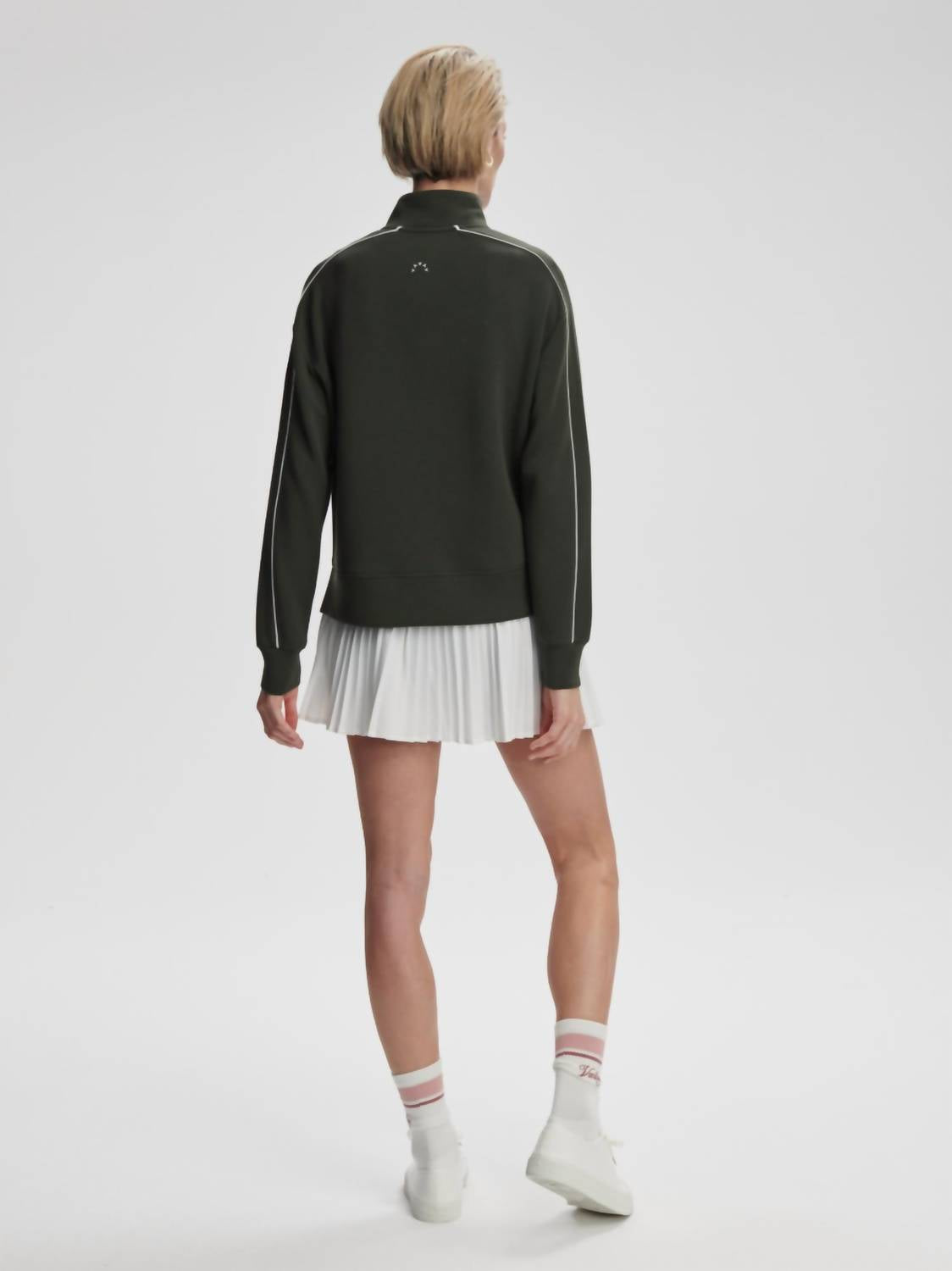 A jacket so versatile you can literally wear it with anything. Introducing the Varley Kirsi Half Zip Midlayer in Deep Ivy, a chic addition to your winter wardrobe perfect for travel and athleisure activities. Designed with long sleeves and crafted from soft modal fabric, it features a mockneck and zip closure for added style and comfort. This casual jacket, with its classic pullover shape, retains a sleek appearance with added piping and panelling. Care instructions: Machine wash and lay flat to dry. Model is 5'9.5" and wearing a size S with a front length of 23.2".