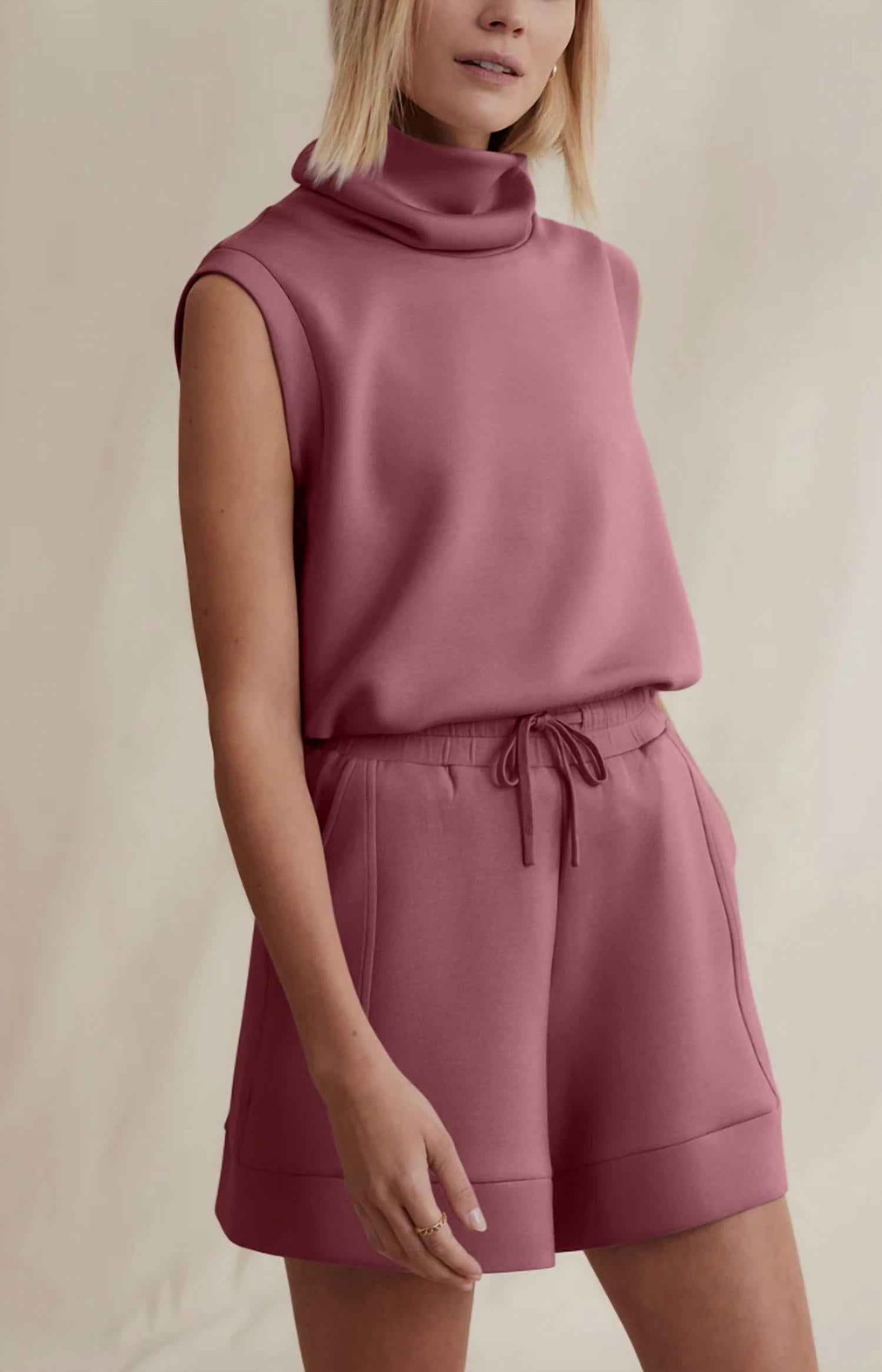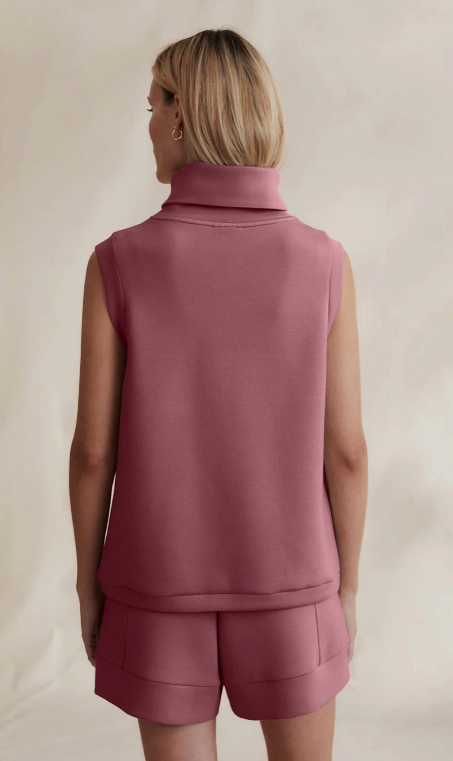 Fit, fabric and functionality. This tank top checks all the boxes. Embrace comfort and style with the Leigh High Neck Tank by VARLEY in the striking Wild Rhubarb shade. This sleeveless, lightweight top is expertly crafted from a blend of 72% Viscose, 23% Polyester, and 5% Elastane, featuring a high roll neck and a drawcord hem for a relaxed fit. The pull-on closure ensures easy wear, making it perfect for summer outings or workouts. Care for this piece with a cool machine wash and lay flat to dry for lasting quality. Model is 5'4" and wearing a size extra small, though it runs slightly large, so consider sizing down.