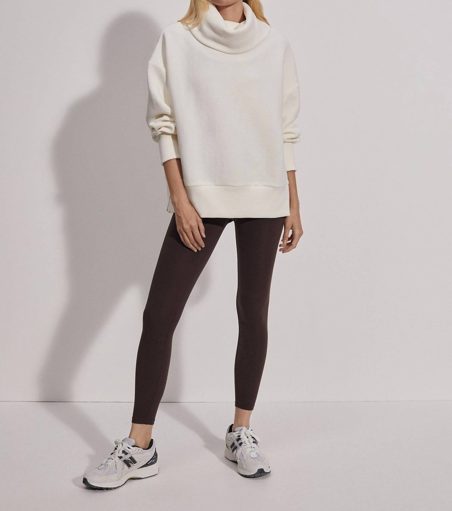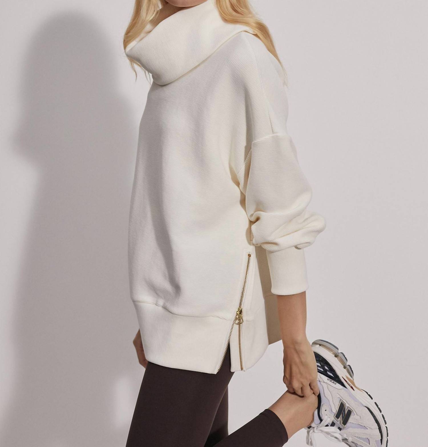 Cooler temps call for layering and we love this adorable sweatshirt for all the obvious reasons. Introducing the Milton Sweat by VARLEY, an essential piece for any contemporary wardrobe in the elegant Egret color. With its oversized design, this sweat features long, beautifully bellowed sleeves, side zip detailing, and deep cuffs, all wrapped up in a cozy turtleneck. Meticulously crafted from a 53% Cotton, 46% Polyester, and 1% Elastane blend, it offers both style and comfort with a pull-on closure. Care for this solid pattern sweatshirt with a machine wash cool, line dry, and ensure to fasten zips before washing. Models are 5'10" and wear a size small.