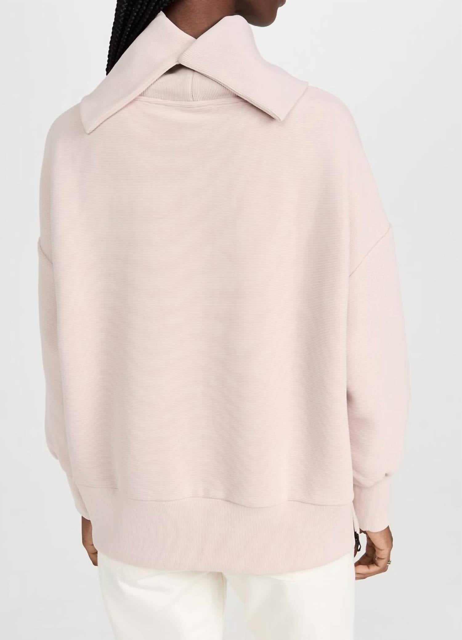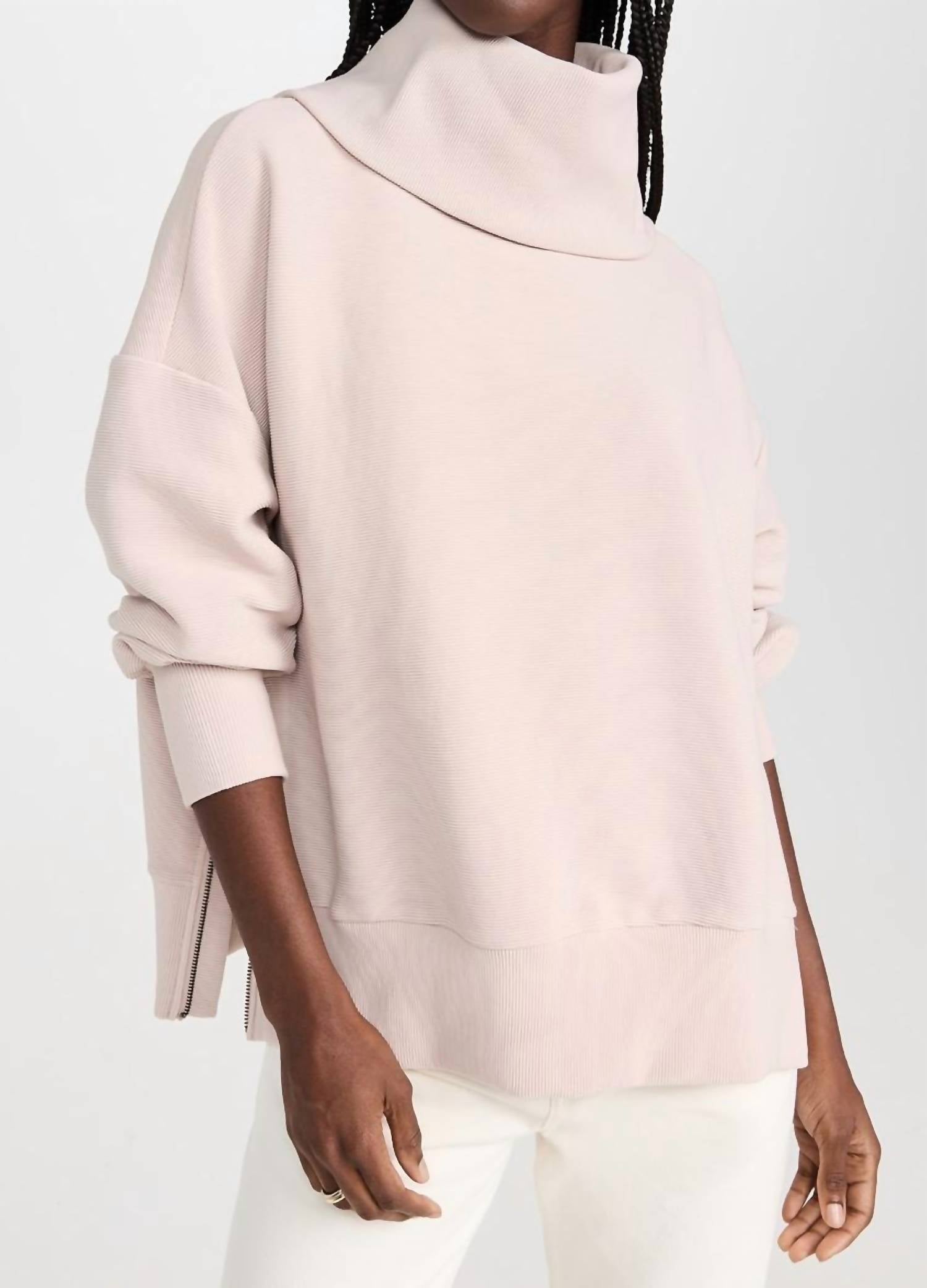 Whether you're running around town or lounging at home, this sweatshirt works for both. Elevate your wardrobe with the Milton Turtleneck Sweatshirt by VARLEY, designed for everyday elegance in a sophisticated mushroom hue. This oversized sweatshirt features long bellowed sleeves, a relaxed roll neck, and casual dropped shoulders, with a distinctive ribbed Ottoman texture. Composition: 53% Cotton, 46% Polyester, 1% Elastane. Closure: Pull on. Care instructions include machine wash cool, iron on low setting, and wash with similar colors. Garment length: 24 inches.