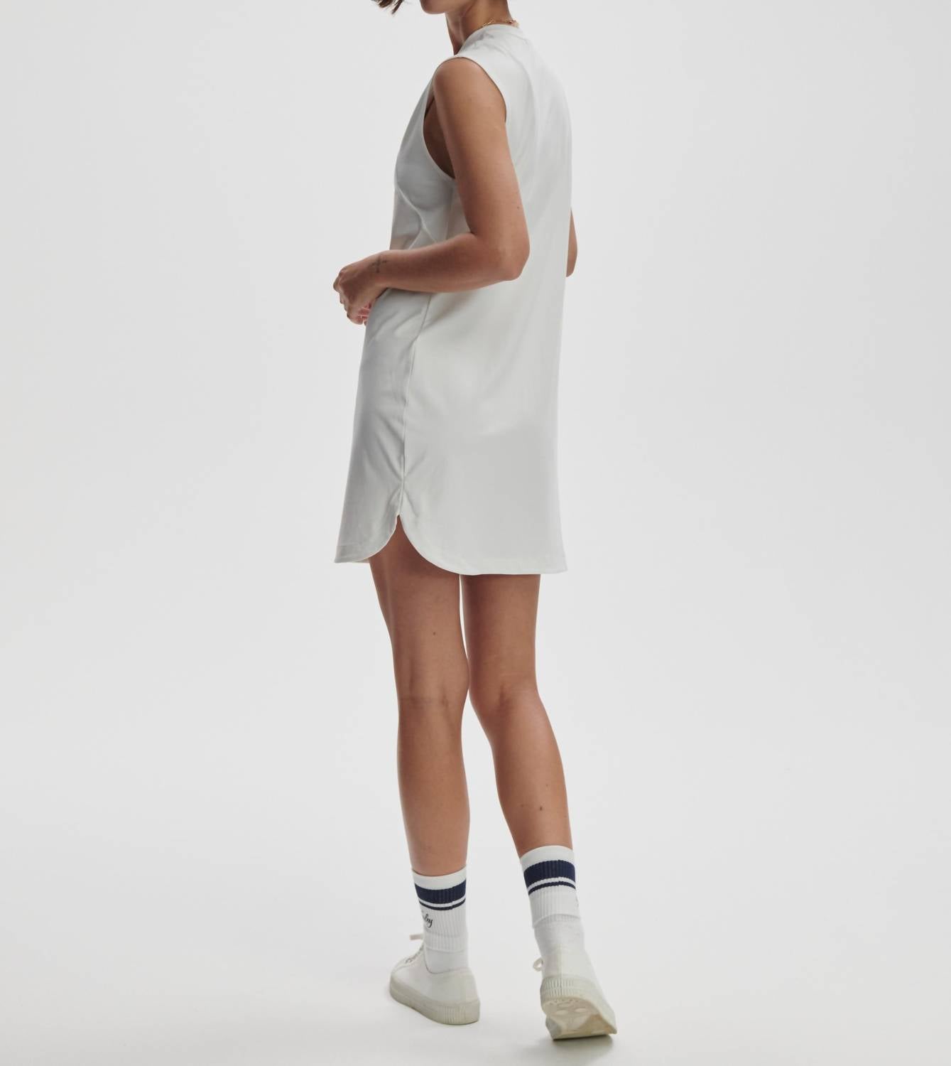 Embrace both style and sustainability with the Naples Dress by VARLEY in elegant white. This sleeveless mini dress is crafted from a cotton blend composition, incorporating Recycled Miro-Poly for a contemporary shift on the traditional tennis dress with a classic crewneck and shaped hem detail. Easily put on with a pull-on closure and designed with inserted armhole panels for added flair, this dress provides lightweight coverage and a relaxed fit. Care recommendations include machine wash cool, avoiding both bleach and tumble dry, with a cool iron for maintenance. The model, standing at 5'10" with measurements of 31" bust, 24" waist, and 34" hips, is wearing a size small, measuring 33.8 inches from side neck to side hem.