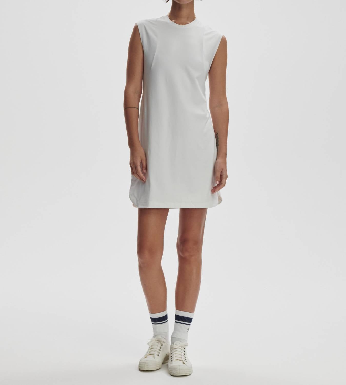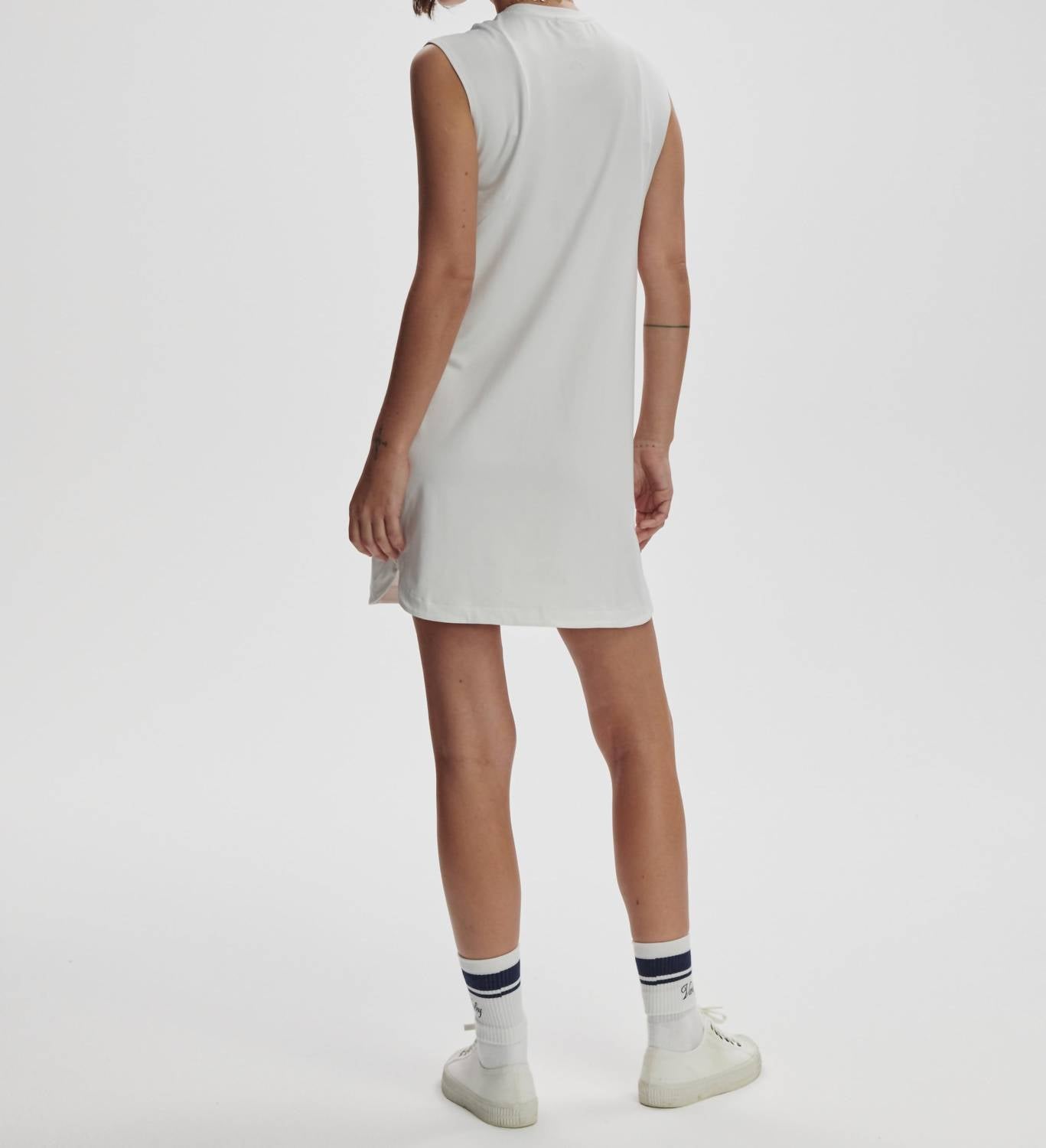 The perfect mini dress for those warmer months. Embrace both style and sustainability with the Naples Dress by VARLEY in elegant white. This sleeveless mini dress is crafted from a cotton blend composition, incorporating Recycled Miro-Poly for a contemporary shift on the traditional tennis dress with a classic crewneck and shaped hem detail. Easily put on with a pull-on closure and designed with inserted armhole panels for added flair, this dress provides lightweight coverage and a relaxed fit. Care recommendations include machine wash cool, avoiding both bleach and tumble dry, with a cool iron for maintenance. The model, standing at 5'10" with measurements of 31" bust, 24" waist, and 34" hips, is wearing a size small, measuring 33.8 inches from side neck to side hem.