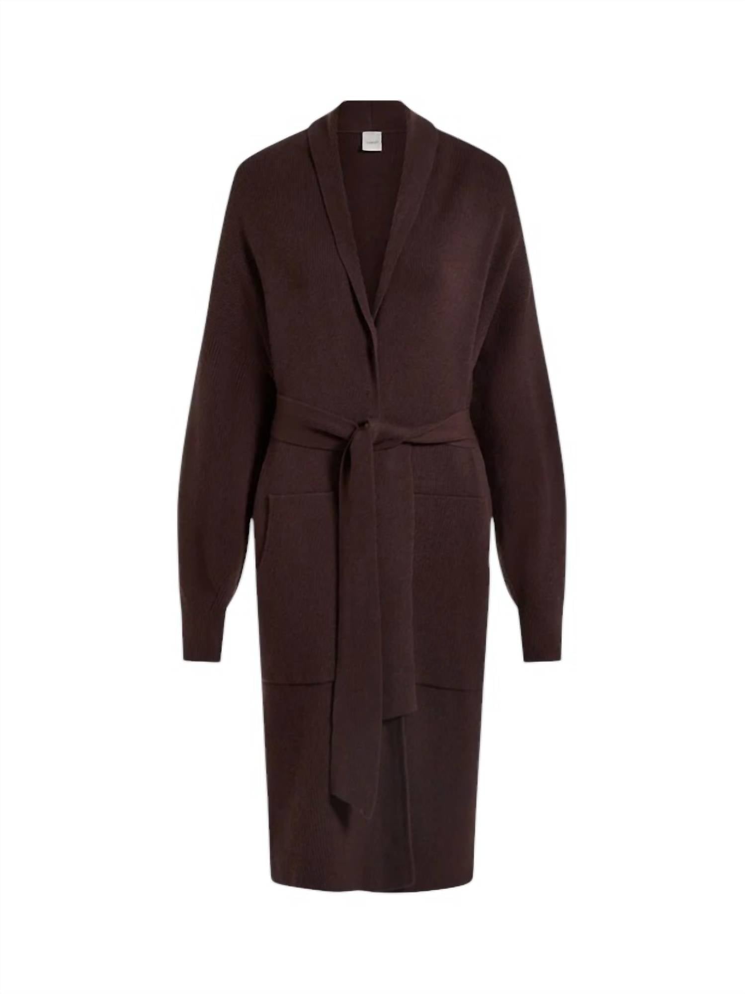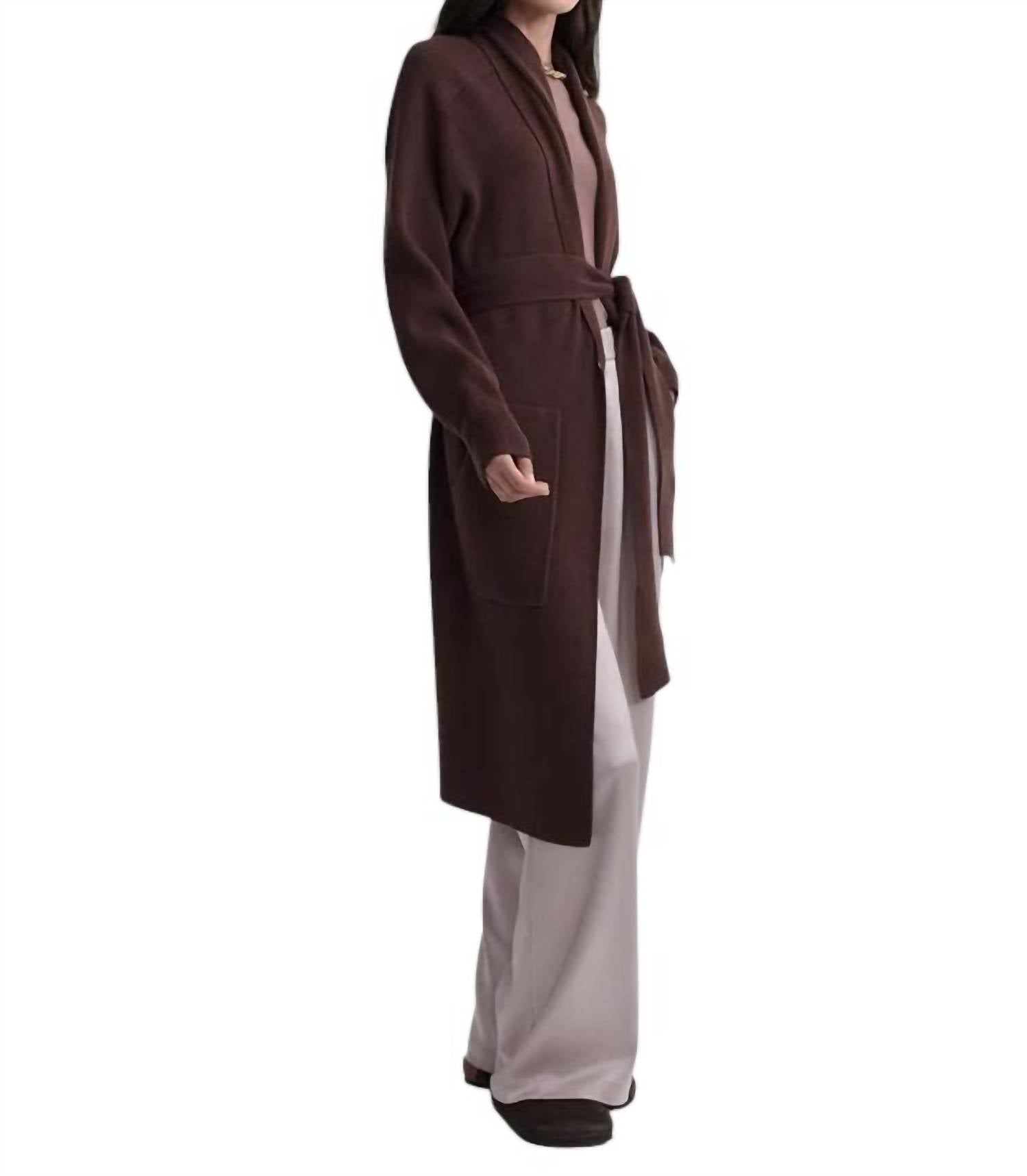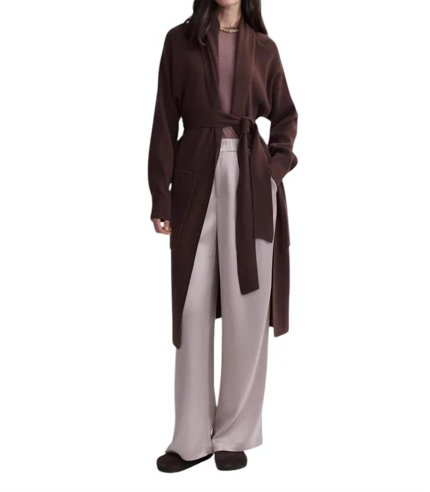 This coat features patch pockets, a relaxed fit, softly shaped shoulders, and a tie detail at the waist. Made of 50% viscose, 30% polyester, and 20% nylon, size S has a front length of 41.34" and a sleeve length of 20.47". Machine wash cool.