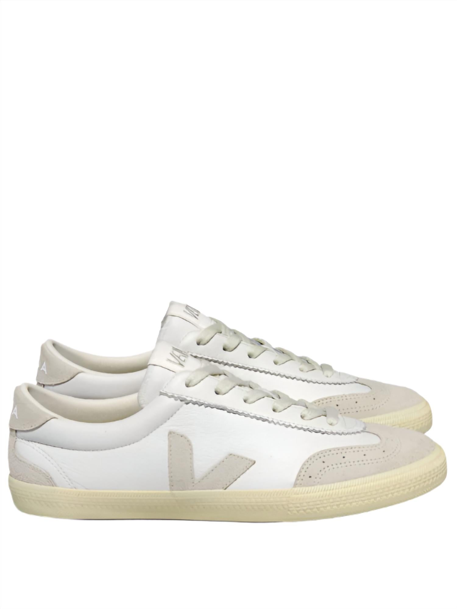 Get your daily steps in with these adorable sneakers. Step into timeless style with VEJA's Women's Volley Leather Shoes, inspired by 70s Brazilian volleyball heritage. Crafted in white organic traced leather with natural shaded suede panels, these sneakers deliver both elegance and eco-friendliness. The insole combines Amazonian rubber, bio-based E.V.A. from sugar cane, recycled E.V.A., and organic cotton for supreme comfort. Made in Brazil, these shoes feature a recycled polyester lining and organic cotton laces for sustainable luxury.