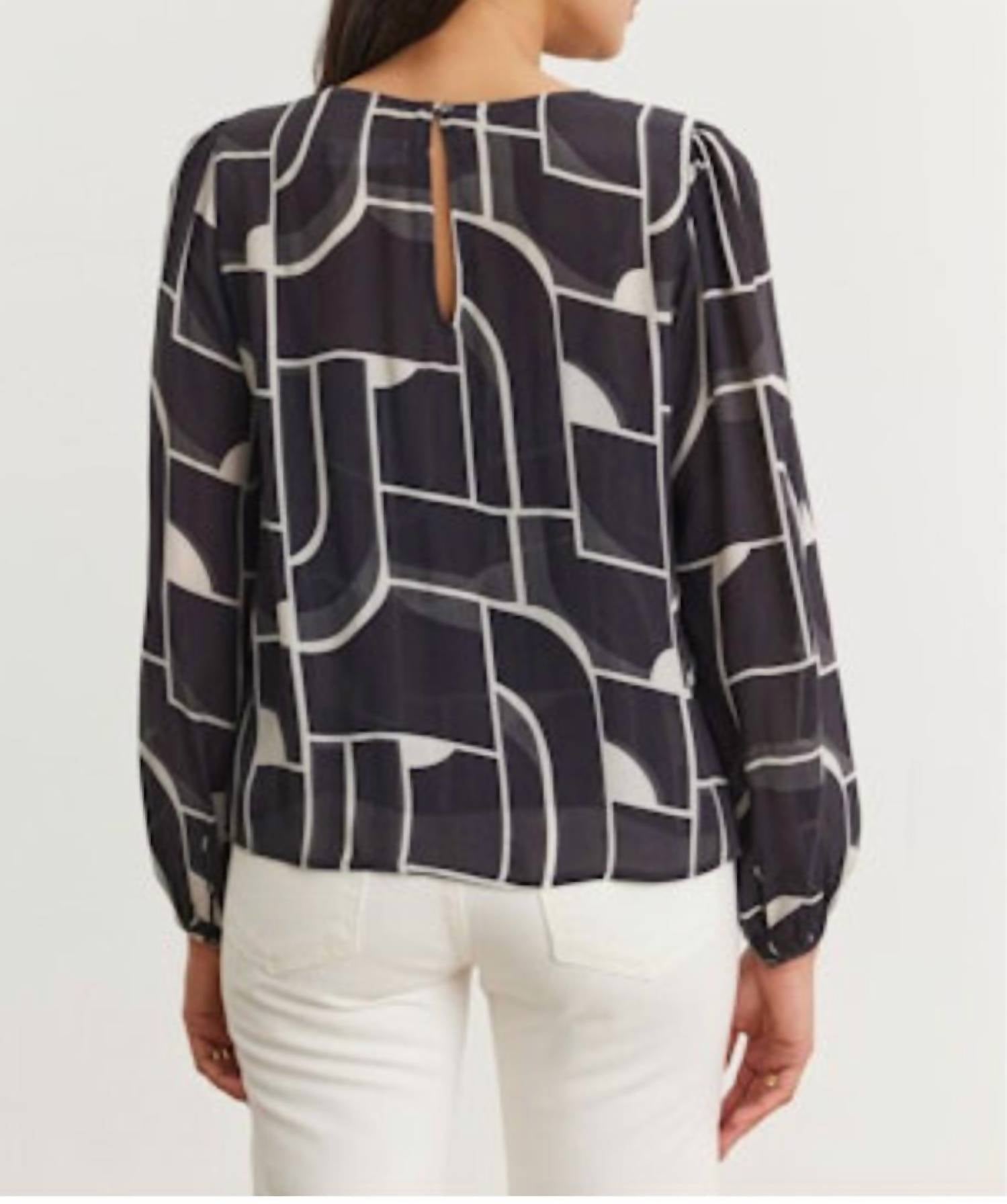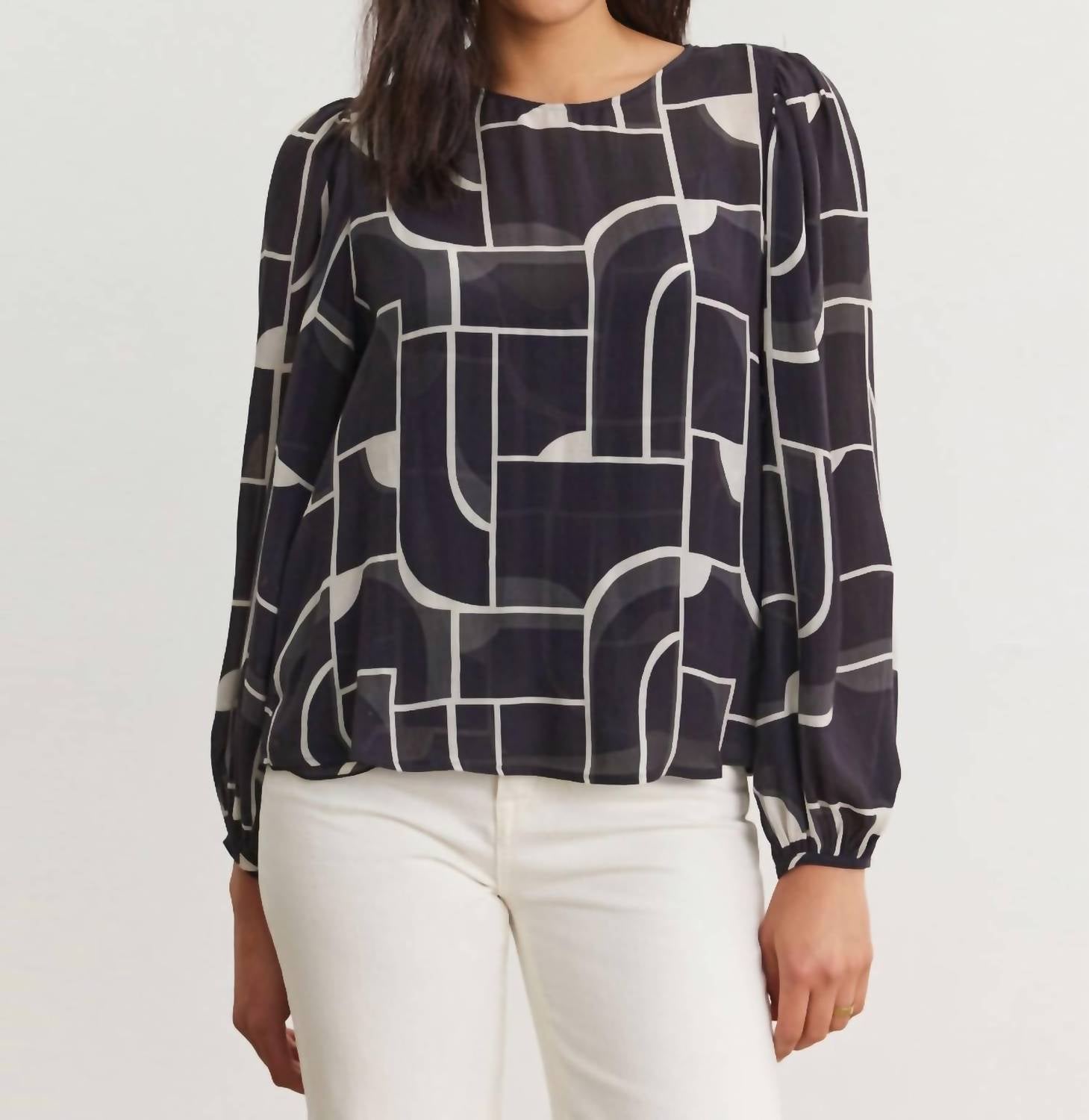 A long sleeve top you can wear with denim, skirts, well... just about anything! Modern style meets comfort effortlessly. Long sleeve top, featuring a stylish bauhaus print and crewneck. Crafted from 100% viscose for a lightweight feel. Pull-on closure ensures convenience. True-to-size fit. Made with care instructions to dry clean only.