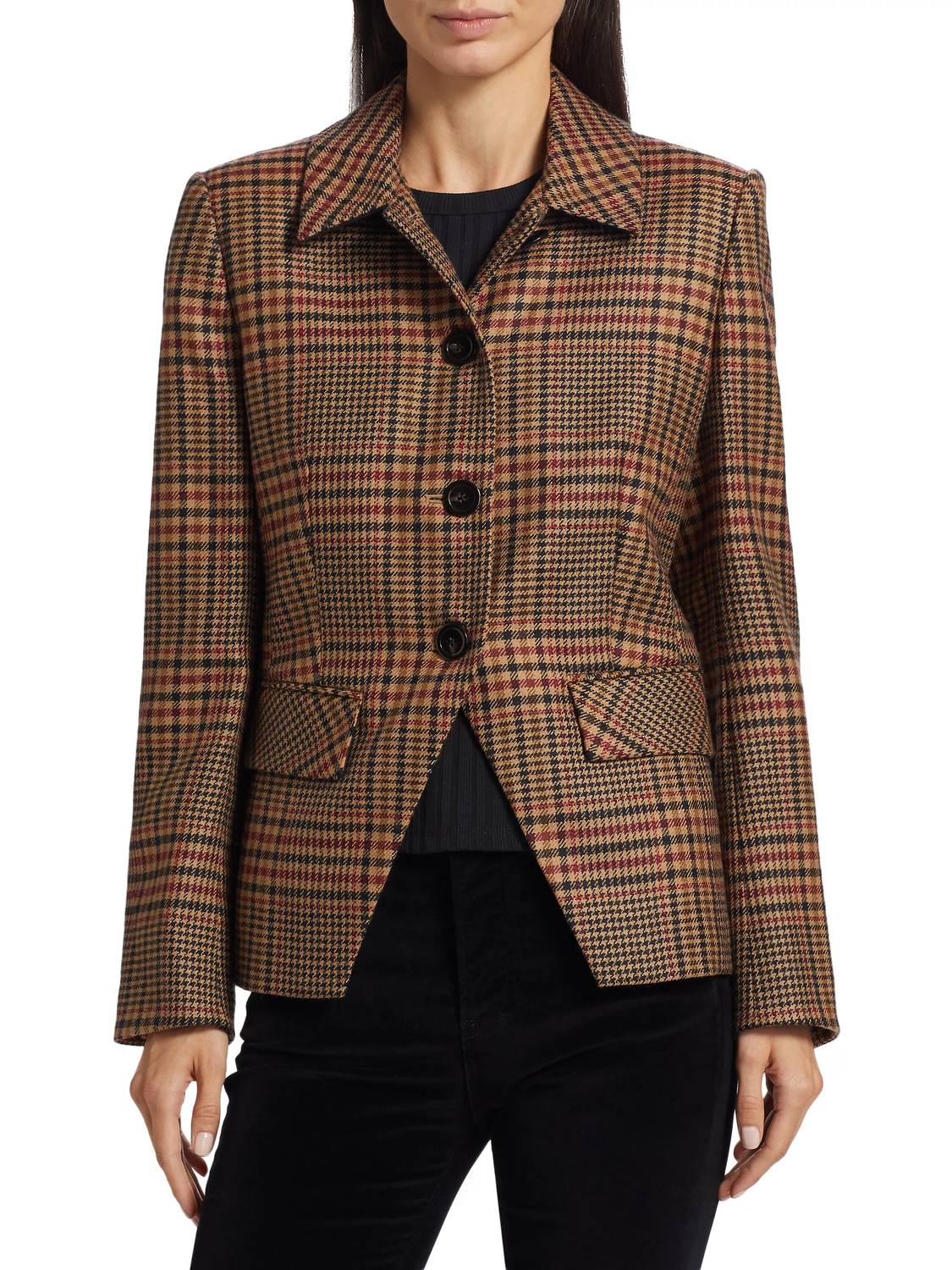 An elevated version of your favorite classic blazer. Introducing the Aire Dickey Jacket by Veronica Beard, a stylish addition to any wardrobe with its classic camel and black plaid design. Crafted from 100% virgin wool, this blazer features long sleeves, button closure, and a tailored fit for a sophisticated silhouette. The collar neckline and pockets provide both elegance and functionality. Care: Dry clean only.