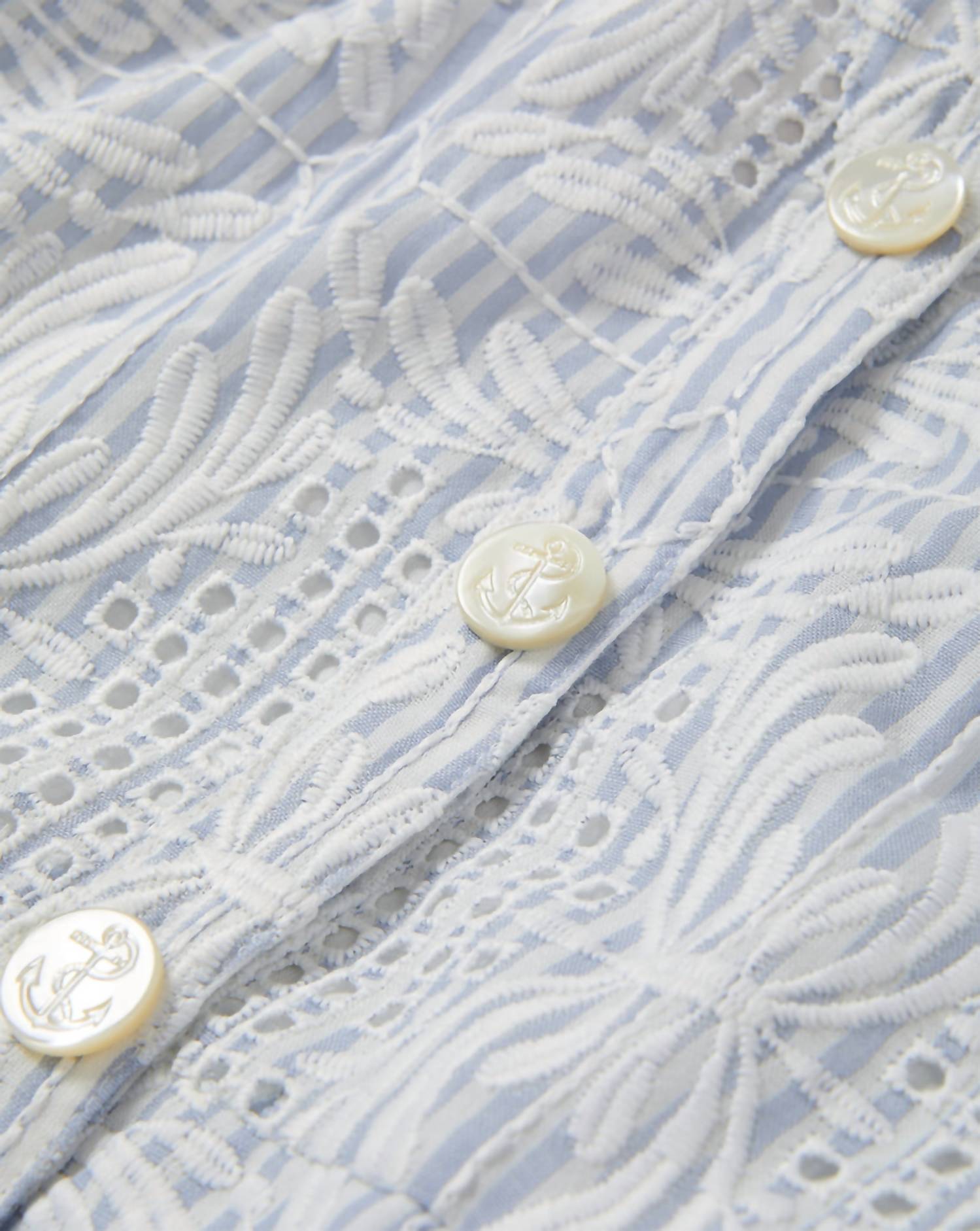 A short and breezy dress for those warmer days. Embrace the essence of summer with the Bobbie Eyelet Mini Dress by Veronica Beard, a charming addition for your Spring wardrobe. This piece showcases short voluminous pouf sleeves and features a V-neckline with a button closure for an elegant finish. Crafted from 64% Polyester and 36% Cotton with a full cotton lining, its 35.25-inch length exudes a timeless A-line silhouette, enhanced by a pretty eyelet and petal pattern in blue and white. For care, ensure to dry clean only and cover buttons.