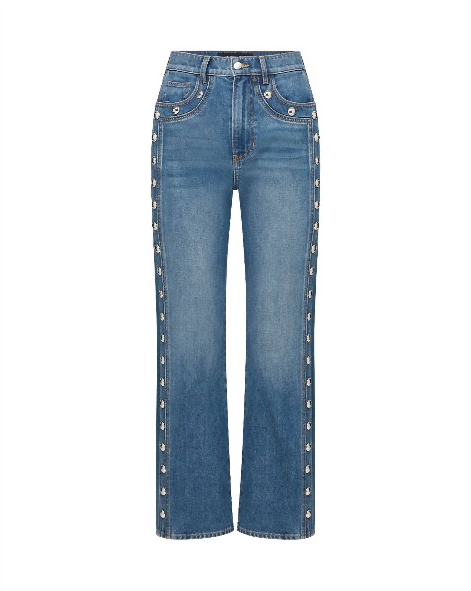 These must-have jeans are fit to perfection. Elevate your denim collection with the Dylan Ankle High Rise Straight Leg Jeans by Veronica Beard, featuring trendy silver studs along the sides. Made from 100% premium Italian Cotton and crafted in the USA, these jeans highlight a relaxed fit with a button closure. The high-rise design is complemented by a 26" inseam, a 11" rise, and a 17.25" leg opening. Perfect for bringing a chic touch to both everyday and special occasions, they are machine washable for easy care.